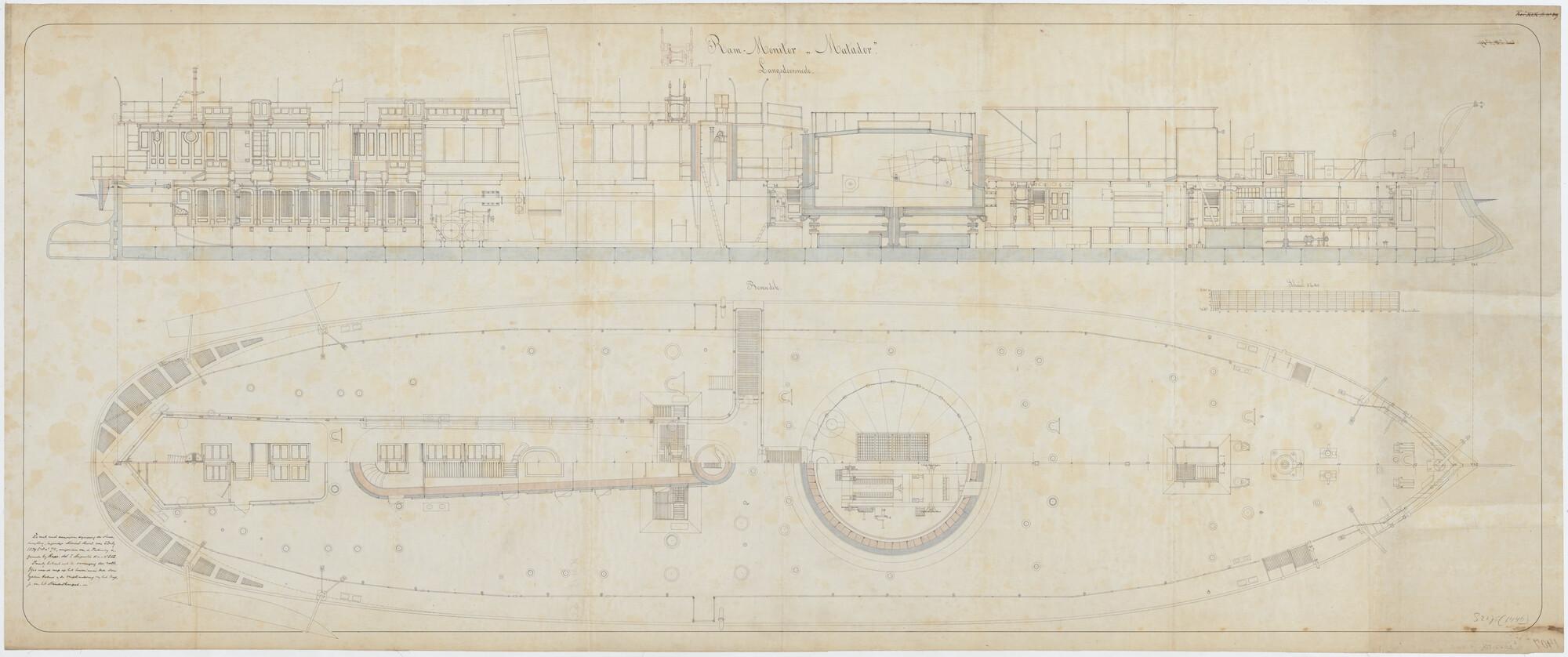Langsdoorsnede en bovenaanzicht van het opperdek van de rammonitor der 1ste klasse Hr.Ms. 'Matador'