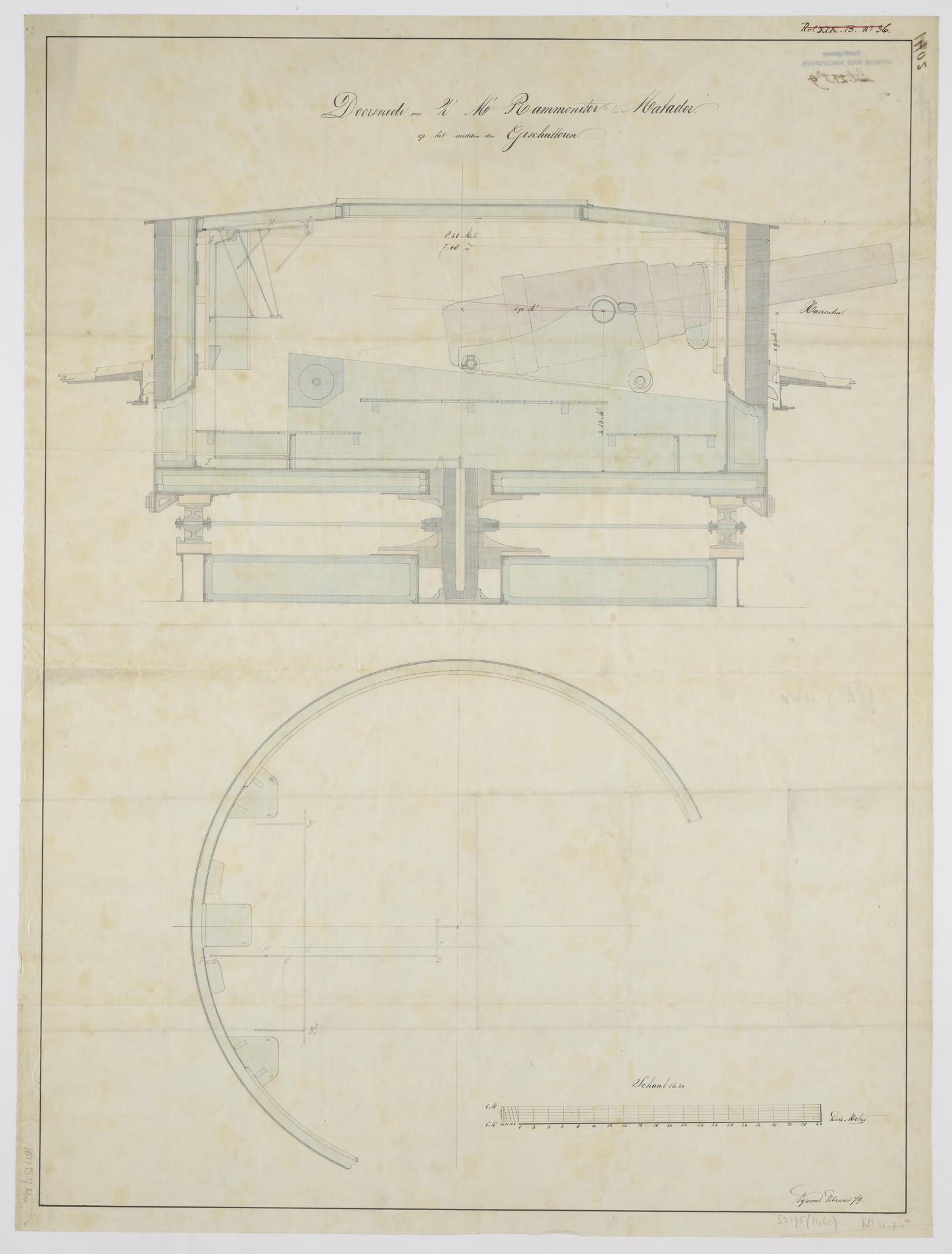 Verticale langsdoorsnede en gedeeltelijke horizontale dwarsdoorsnede van de geschuttoren van de rammonitor der 1ste klasse Zr.Ms. "Matador". Kanon van 28 cm A. op rolpaard. Torenbeweging met draaispil. Pantsergordel met houten beschieting (schaal 1:20).