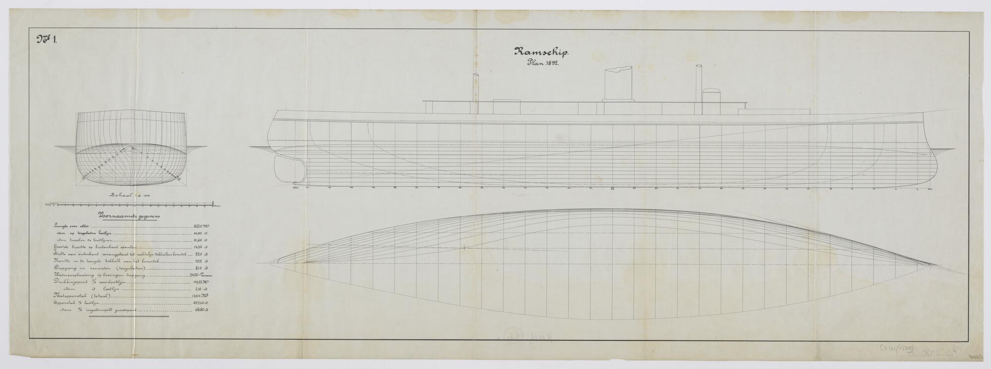 Lijnenplan met spantenraam en overzicht van de voornaamste gegevens van het ramschip plan 1892