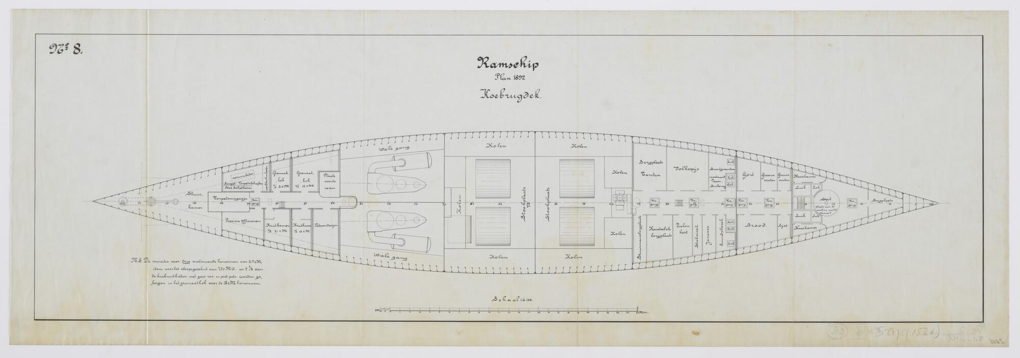 Gedetailleerde indelingstekening van het koebrugdek-voor-en-achter van het ramschip plan 1892, model voor de pantserschepen Hr.Ms. Kortenaer, Hr.Ms. Piet Hein en Hr.Ms. Evertsen (schaal 1:100).