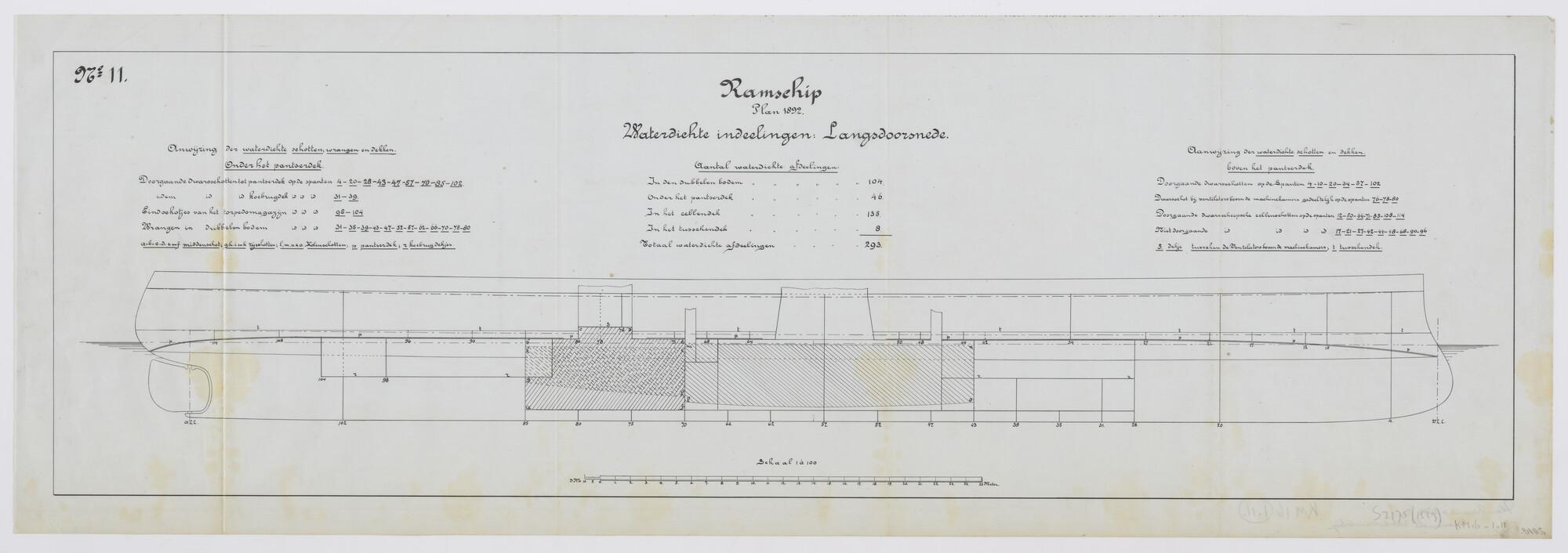 De waterdichte indeling van het ramschip plan 1892, model voor de pantserschepen Hr.Ms. "Kortenaer", Hr.Ms. "Piet Hein" en Hr.Ms. "Evertsen". Waterdichte schotten, wrangen en dekken onder en boven het pantserdek, waterdichte afdelingen (totaal 293) (schaal 1:100).