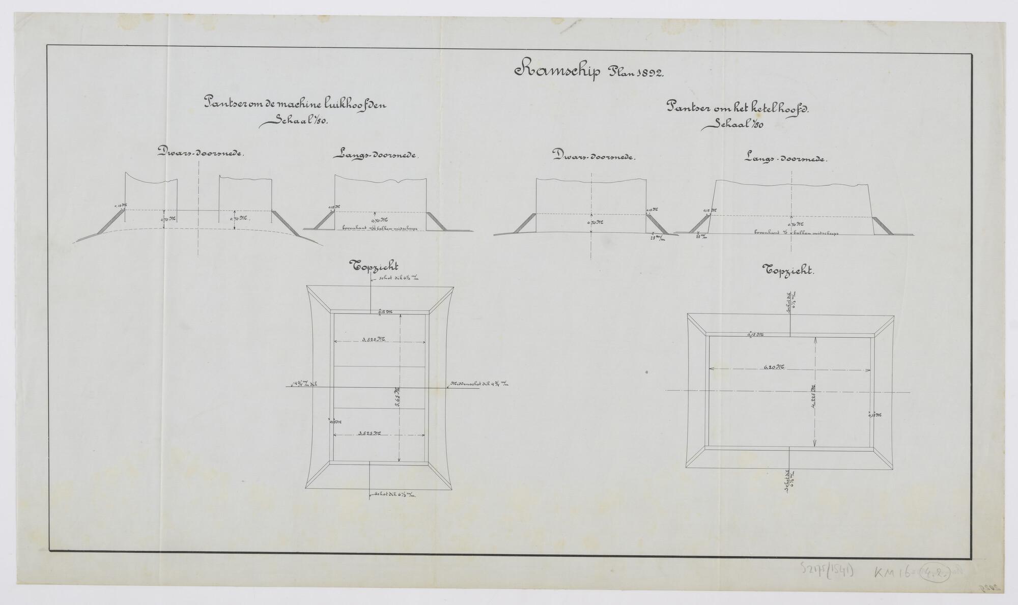 Dwars- en langsdoorsneden en topzichten van het pantser om de machinehoofden en het ketelhoofd van het ramschip plan 1892