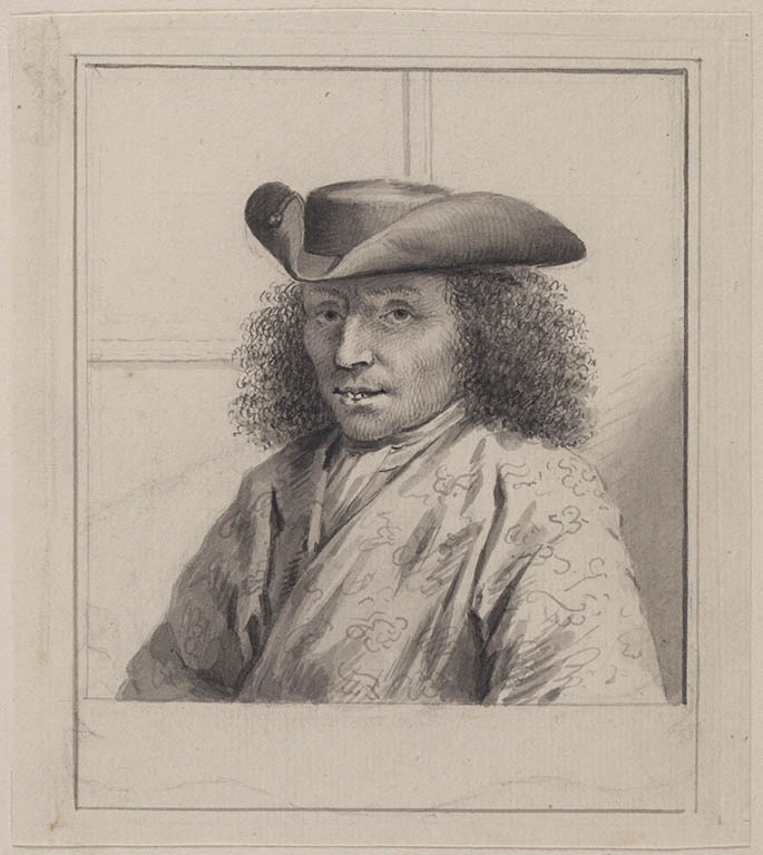 Busteportret en trois-quarts naar links van een man met een steek op het hoofd en schouderlang krullend haar.