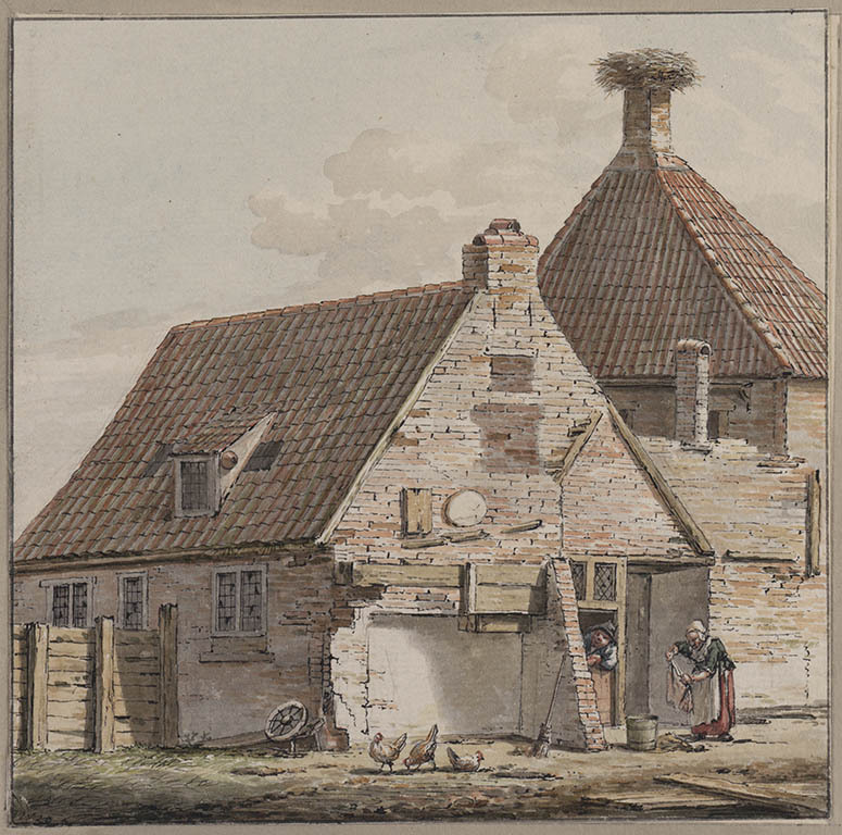 Vervallen huisje met links voor de deur een oude vrouw die de was doet in een ton, over de halve deur leunt een oude man. Op de voorgrond loopt een drietal kippen.