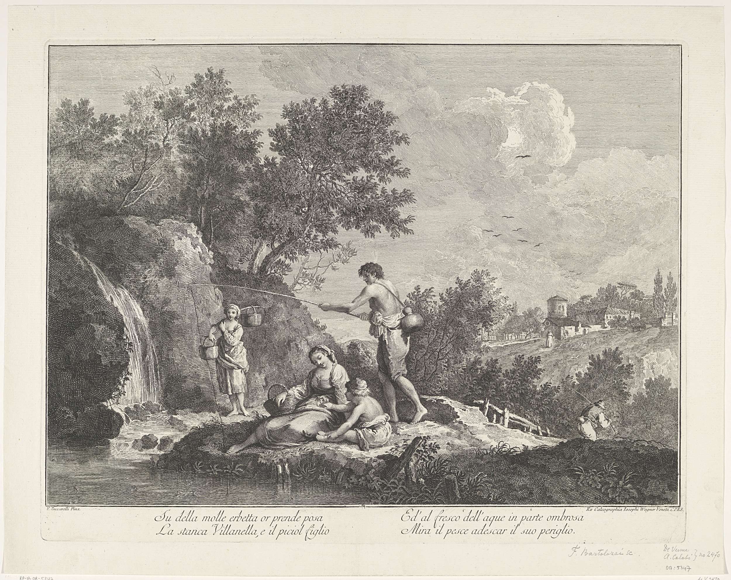 Landschap met zittende vrouw met mand en kind, visse...