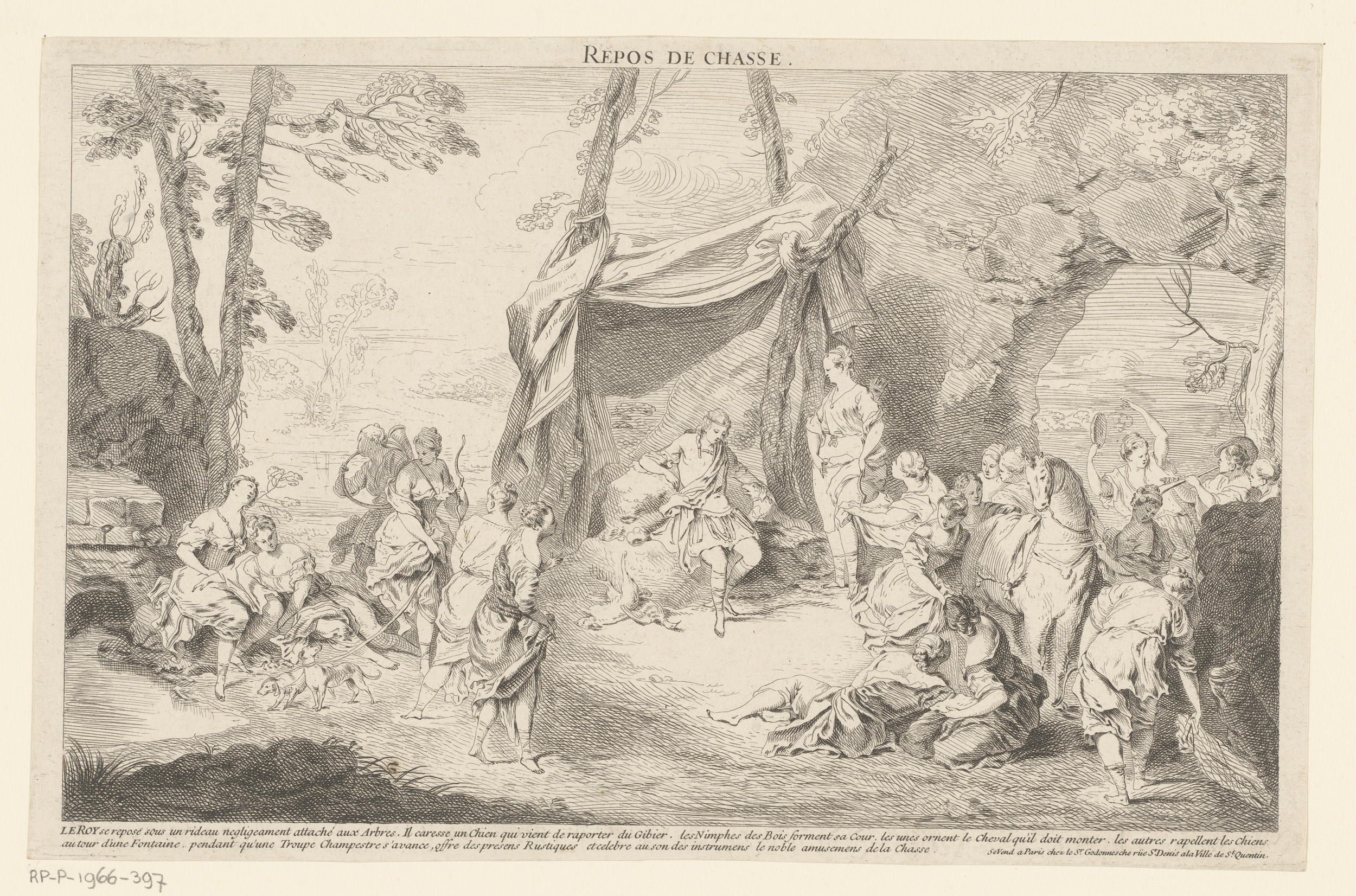 Boslandschap met rustend jachtgezelschap