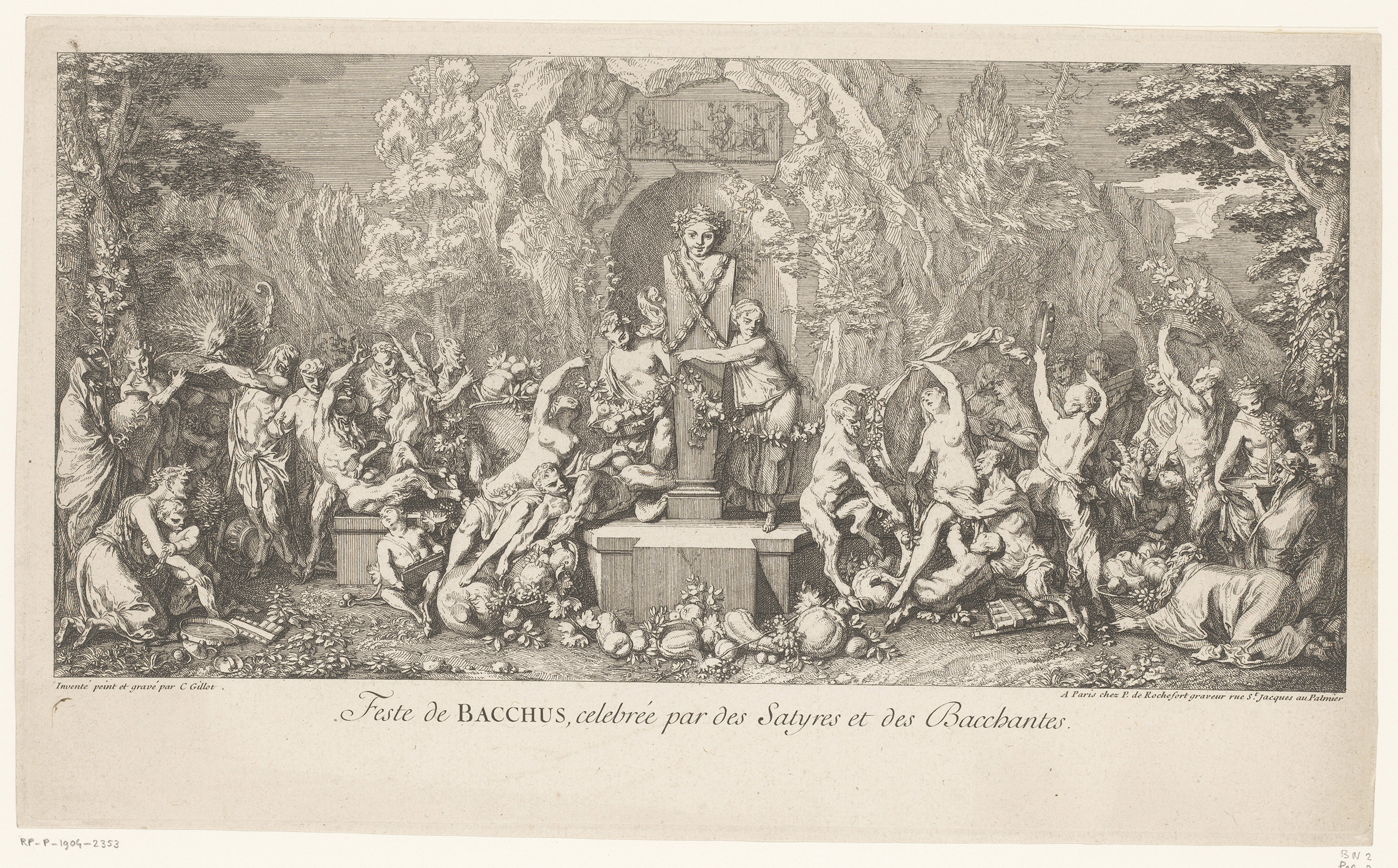 Bacchanaal met saters en bacchanten om een beeld van...