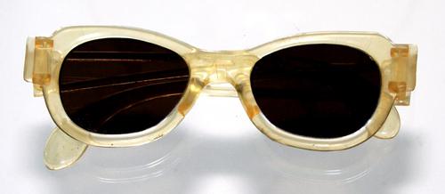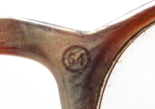 Bril kunststof rood bruin getint. Opdruk 64. 1950