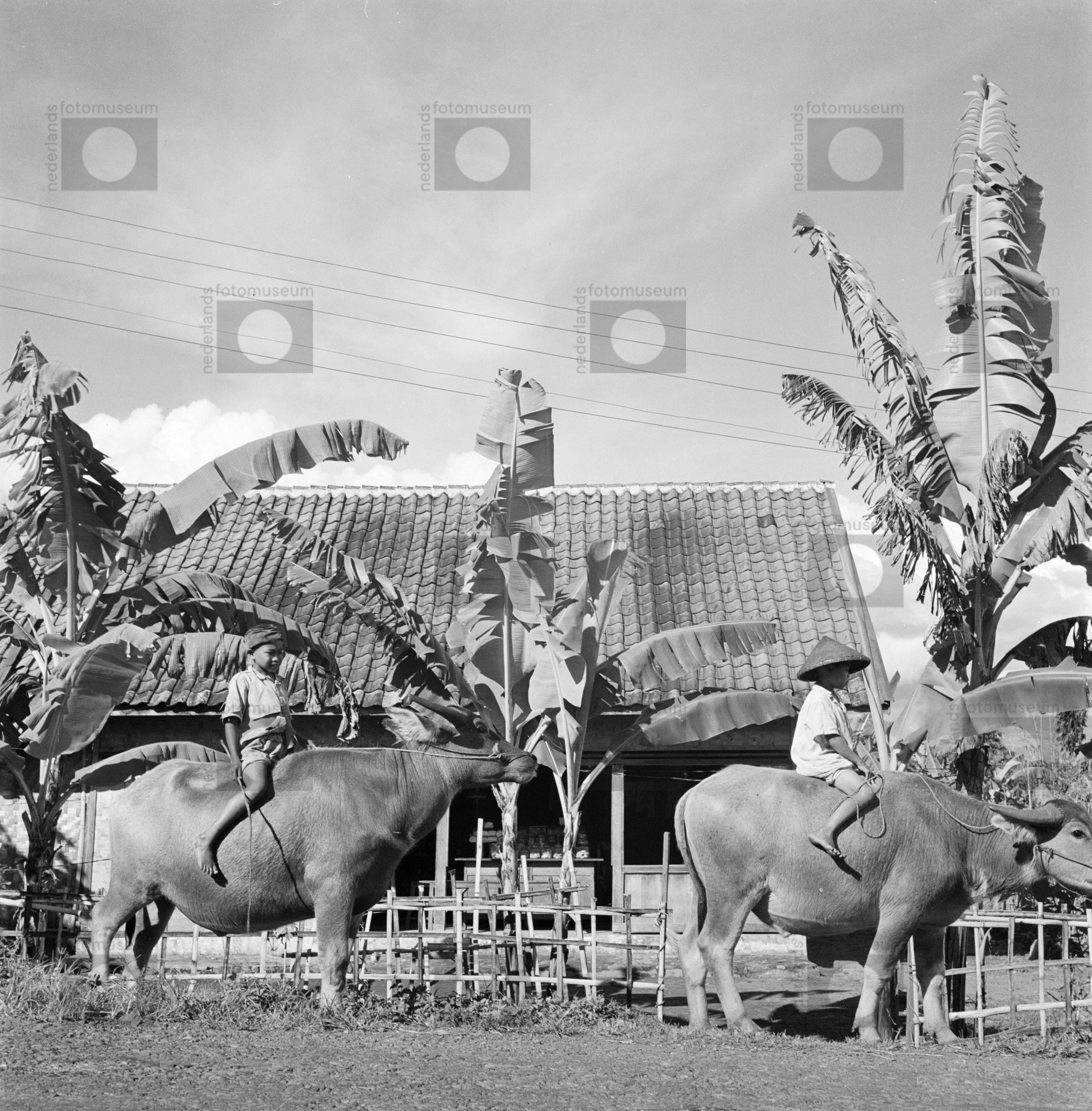 Twee jongens poseren met de waterbuffel, die ze menn...