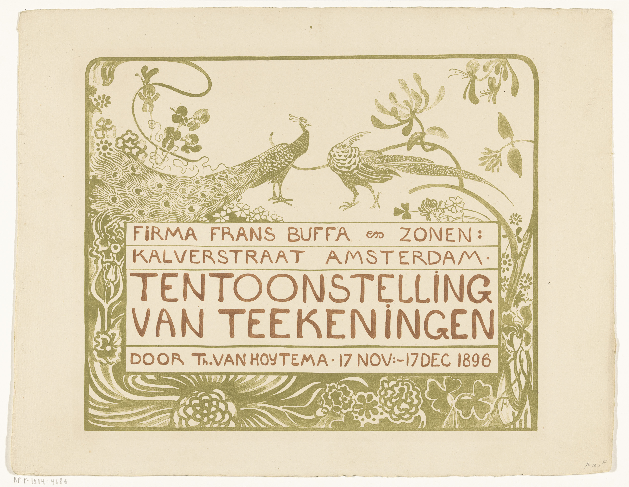 Tentoonstellingsaffiche met een pauw en een fazant v...
