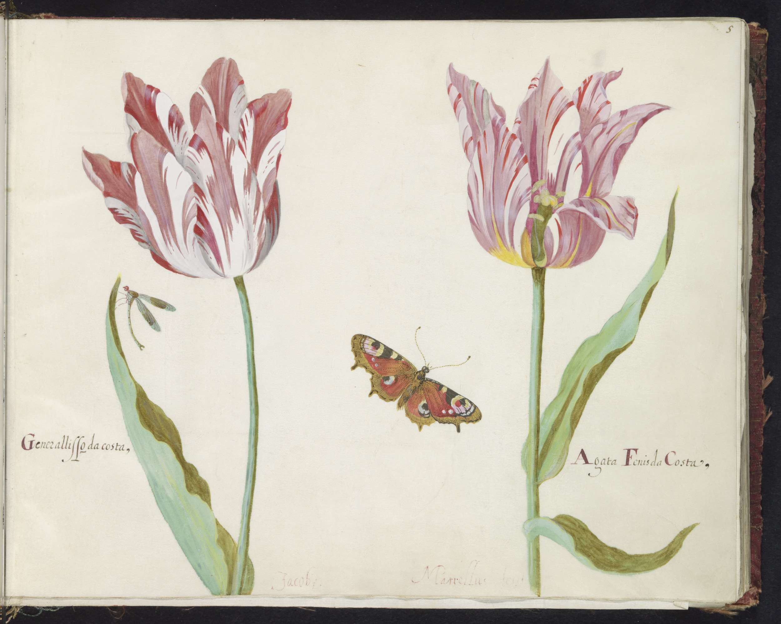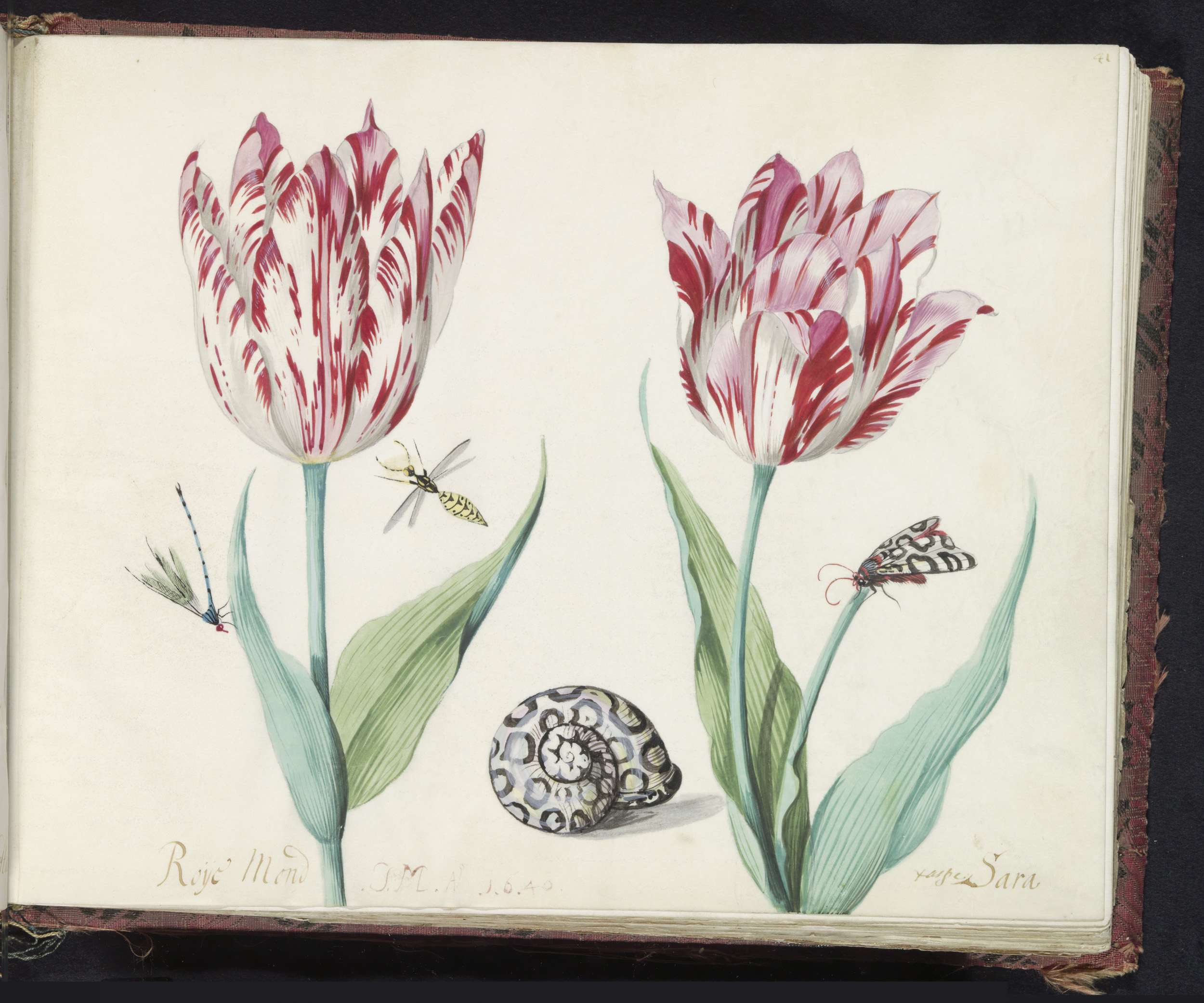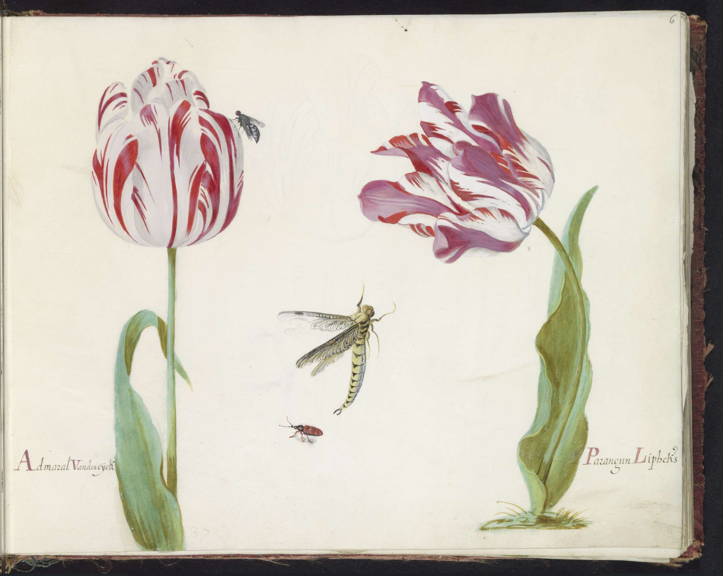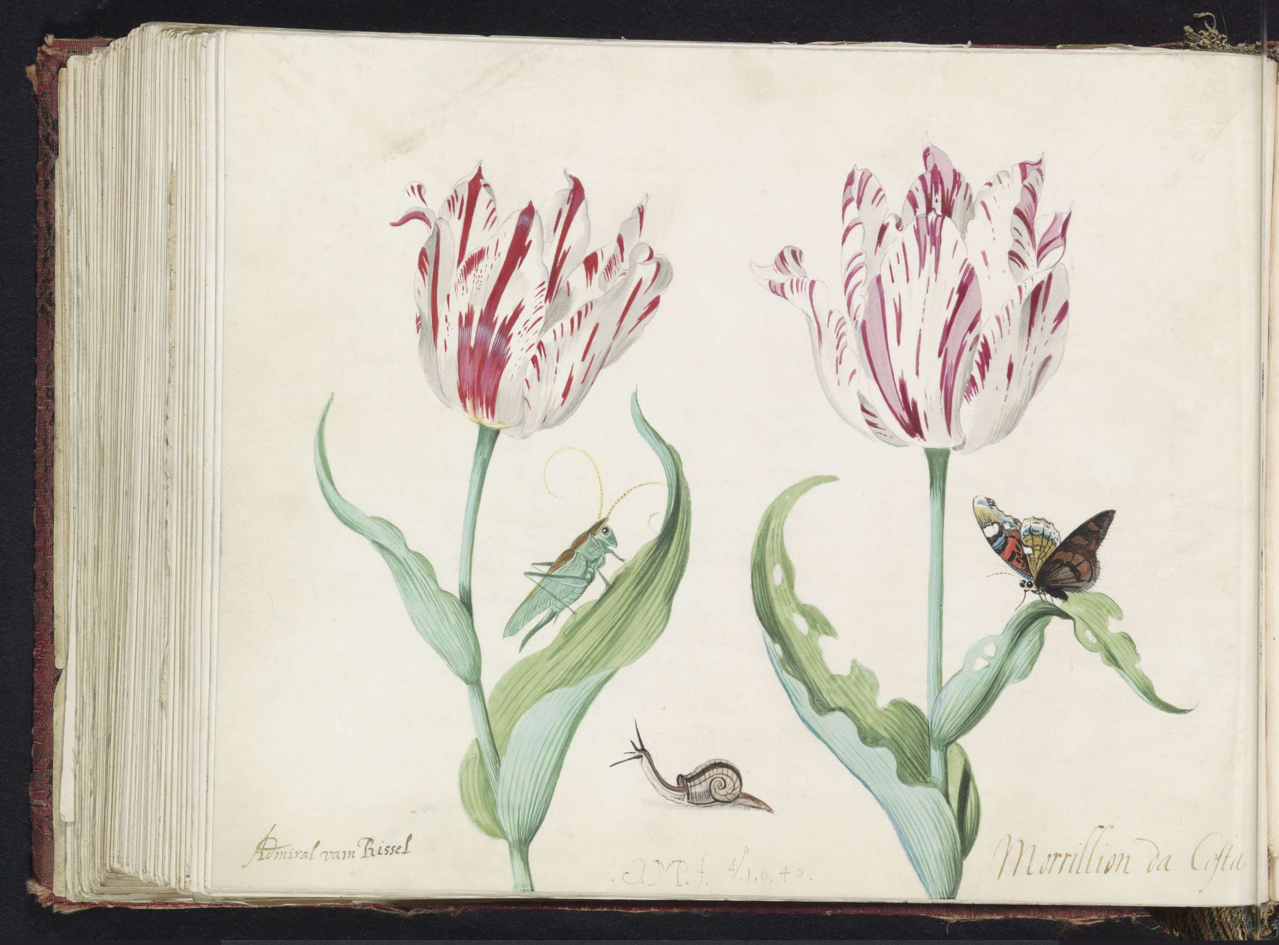 Twee tulpen met slak, nachtvlinder en twee insecten