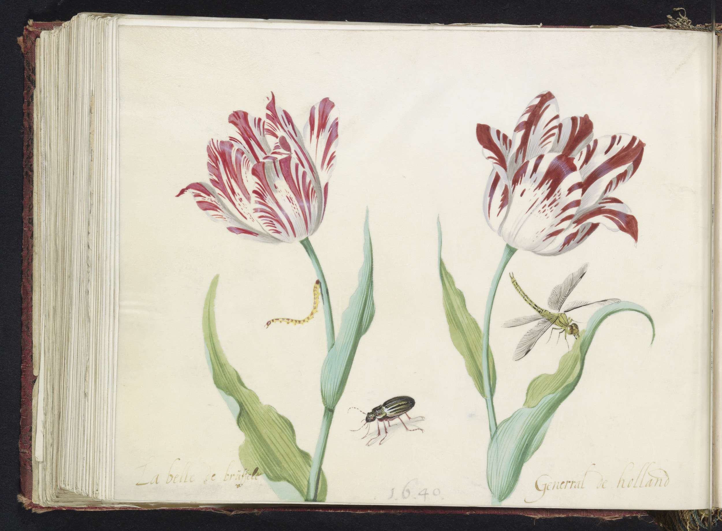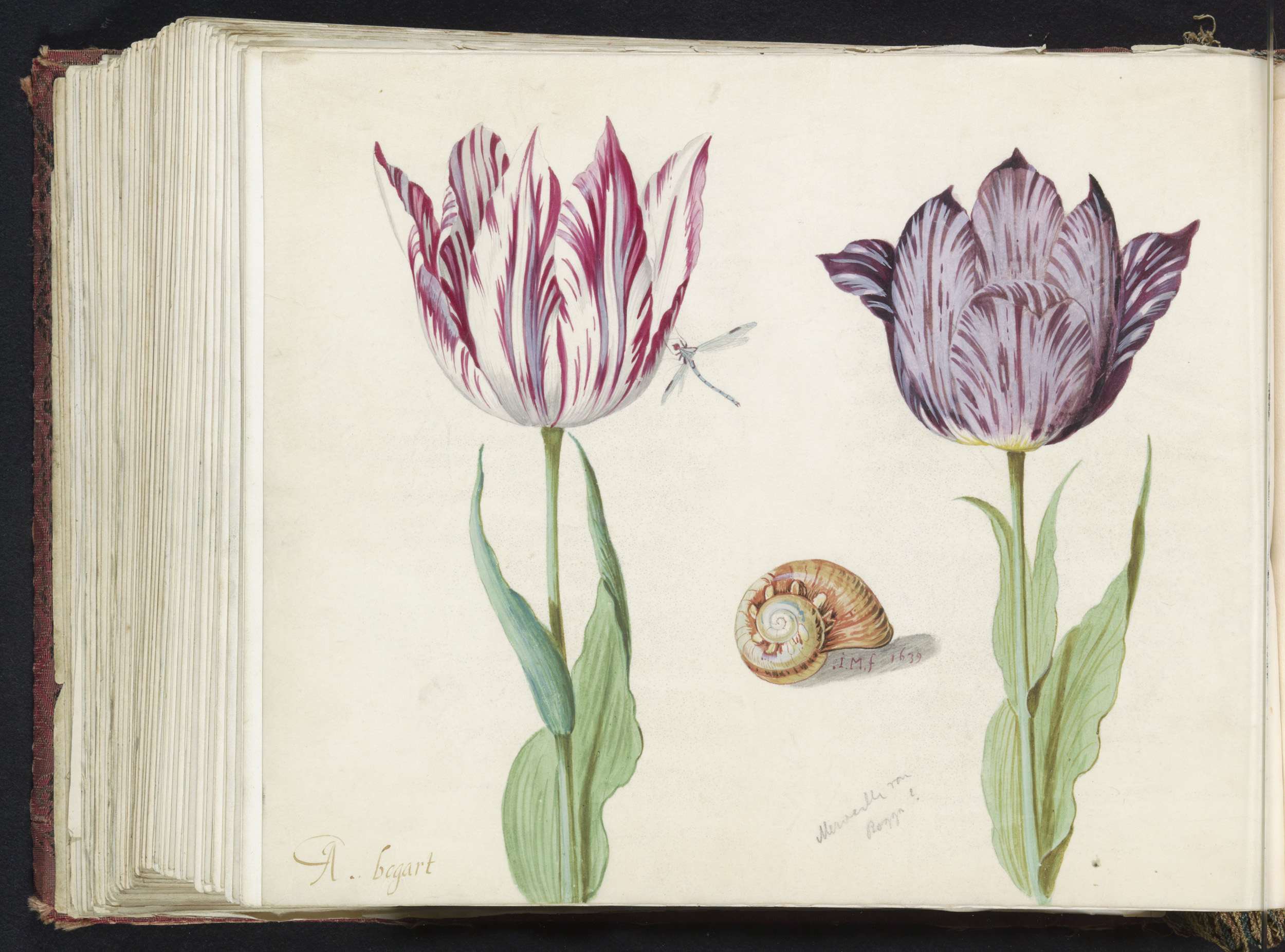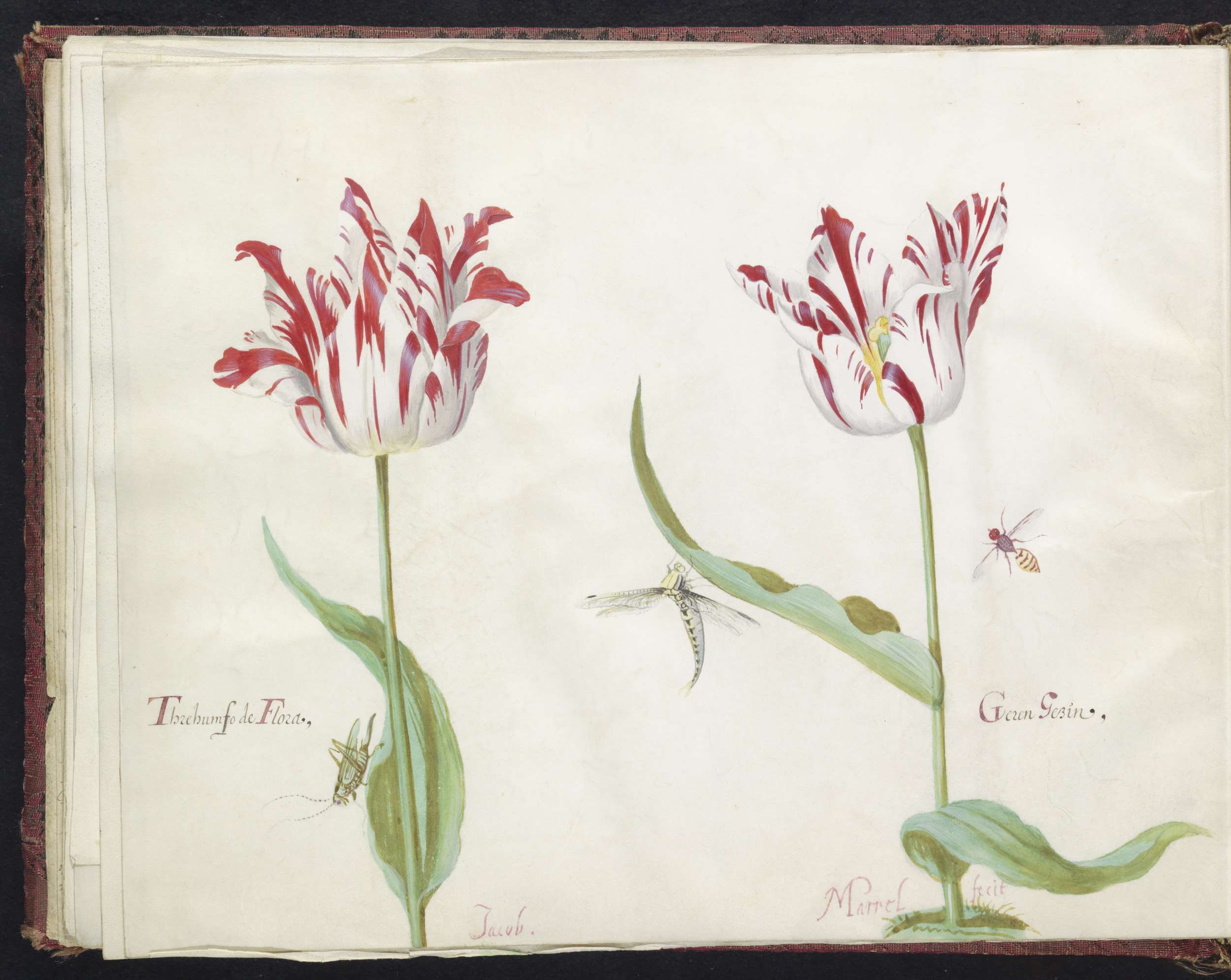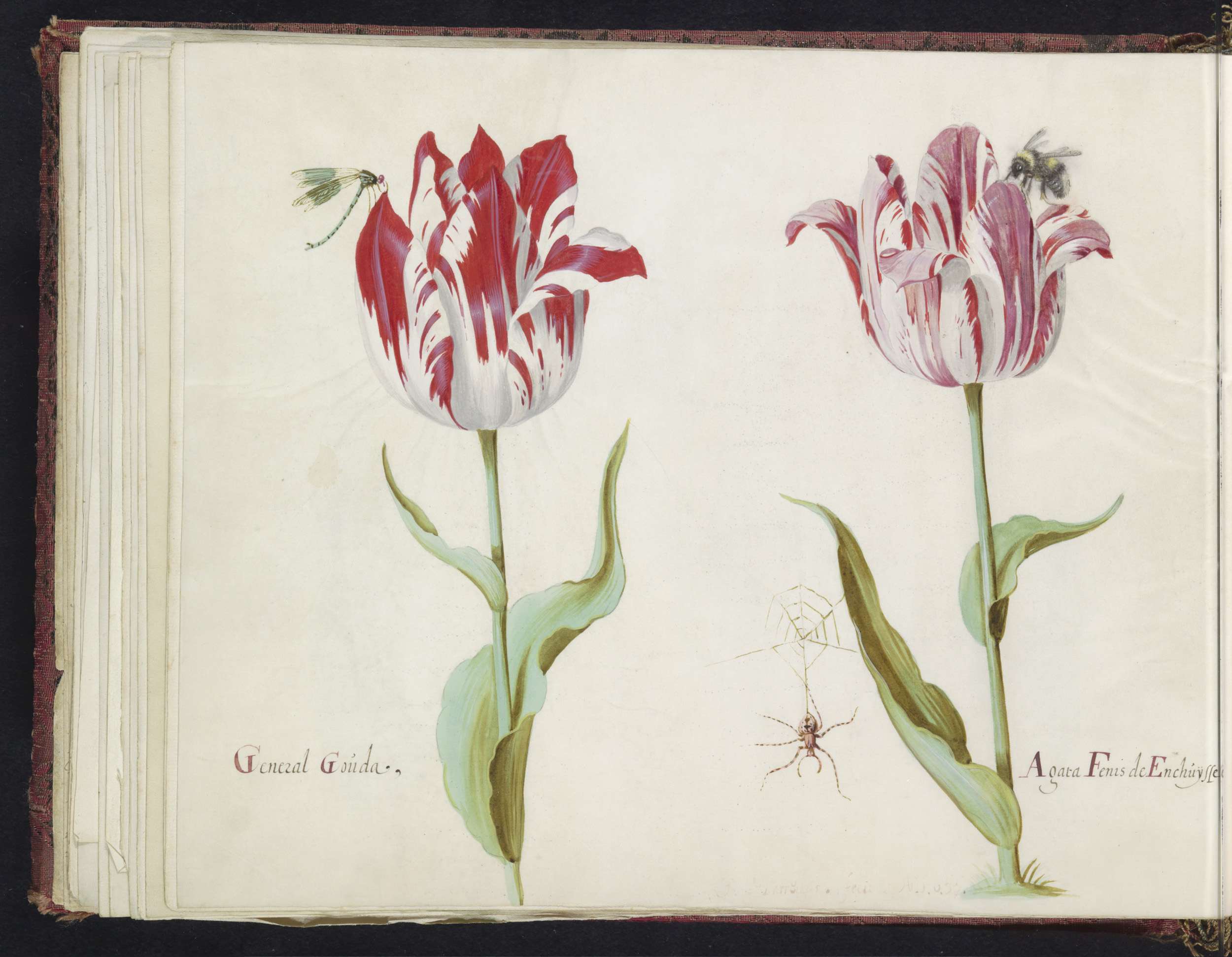 Twee tulpen met slak, nachtvlinder en twee insecten