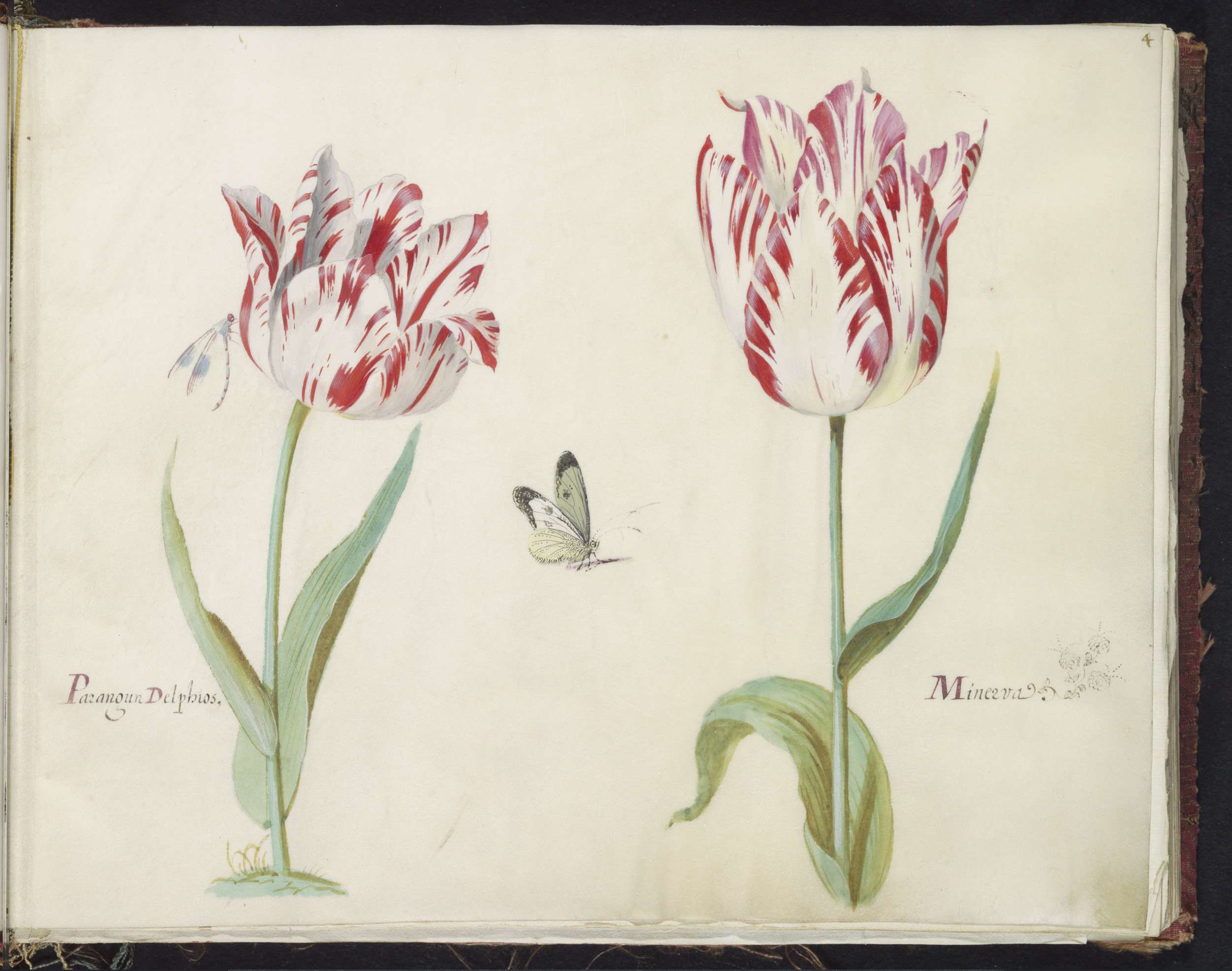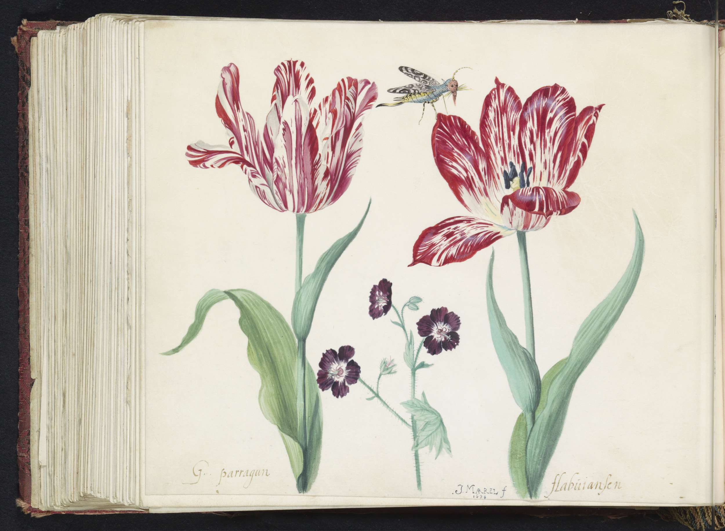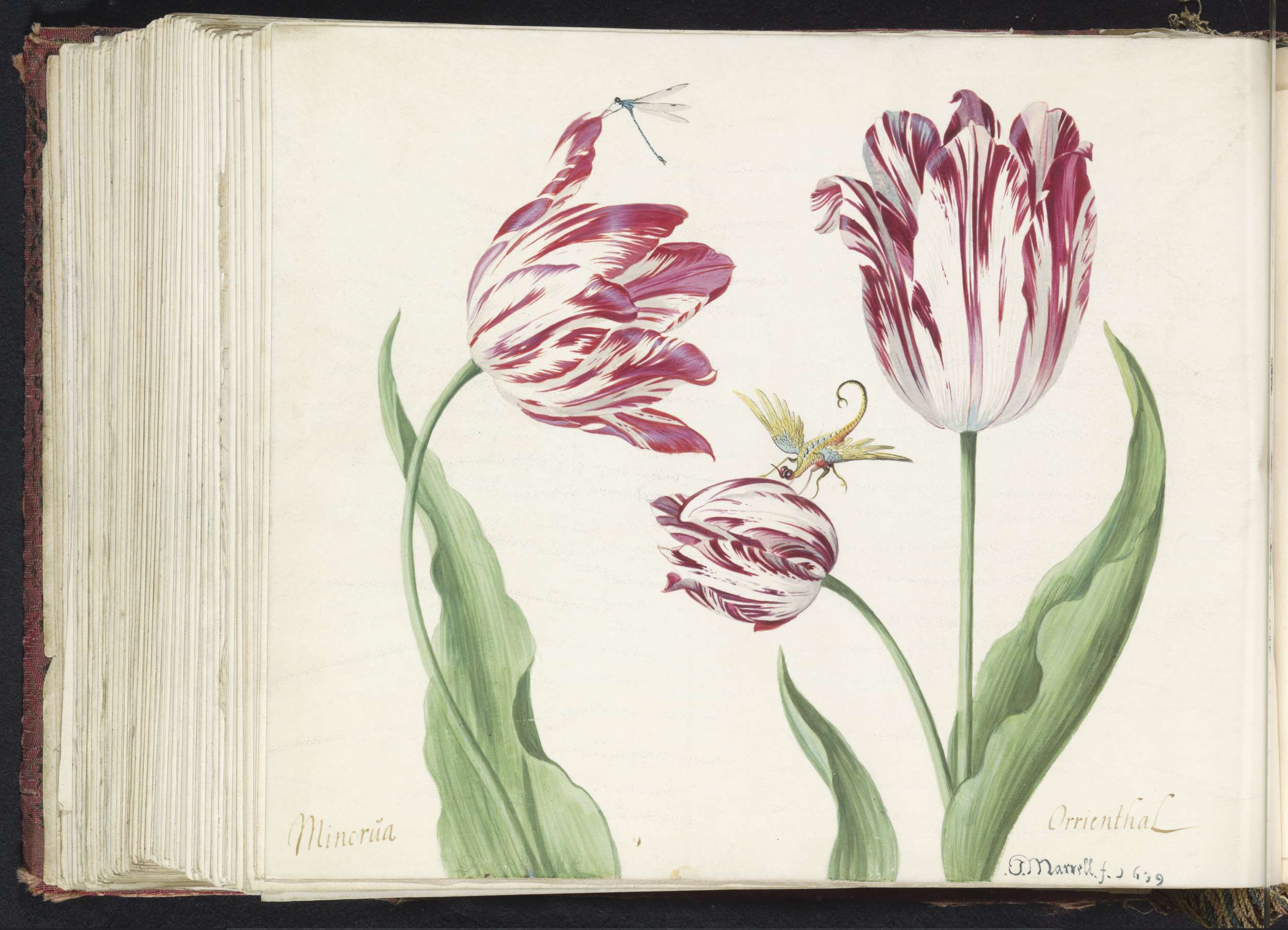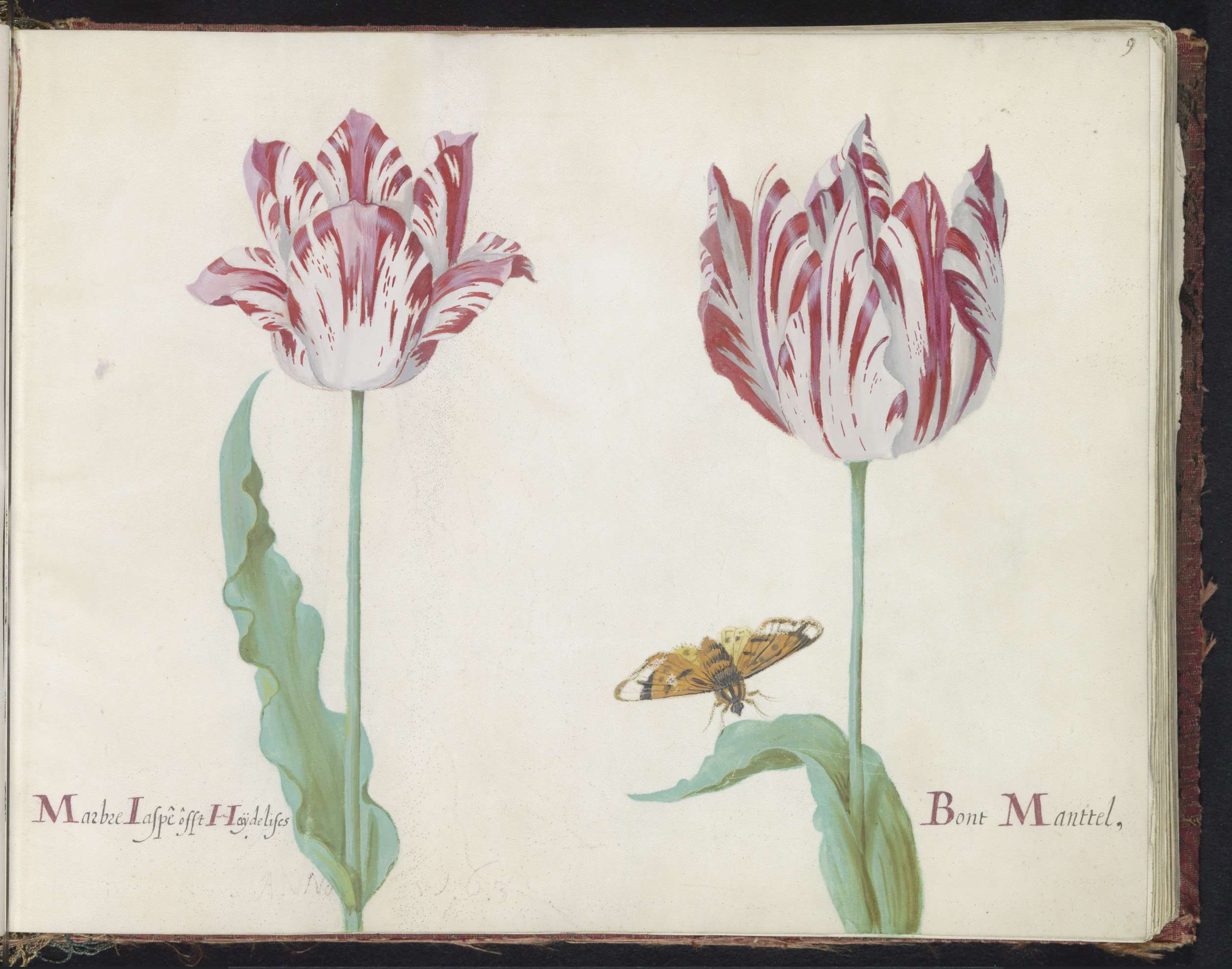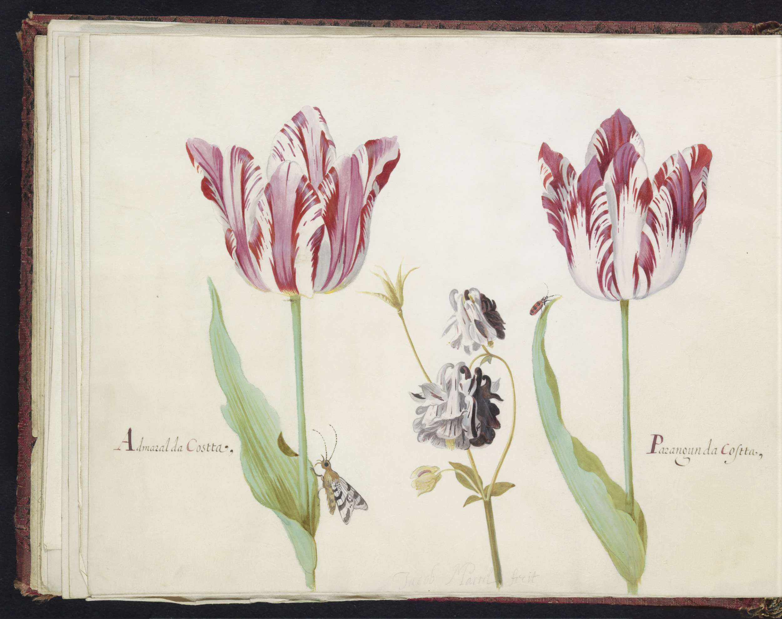 Twee tulpen met slak, nachtvlinder en twee insecten