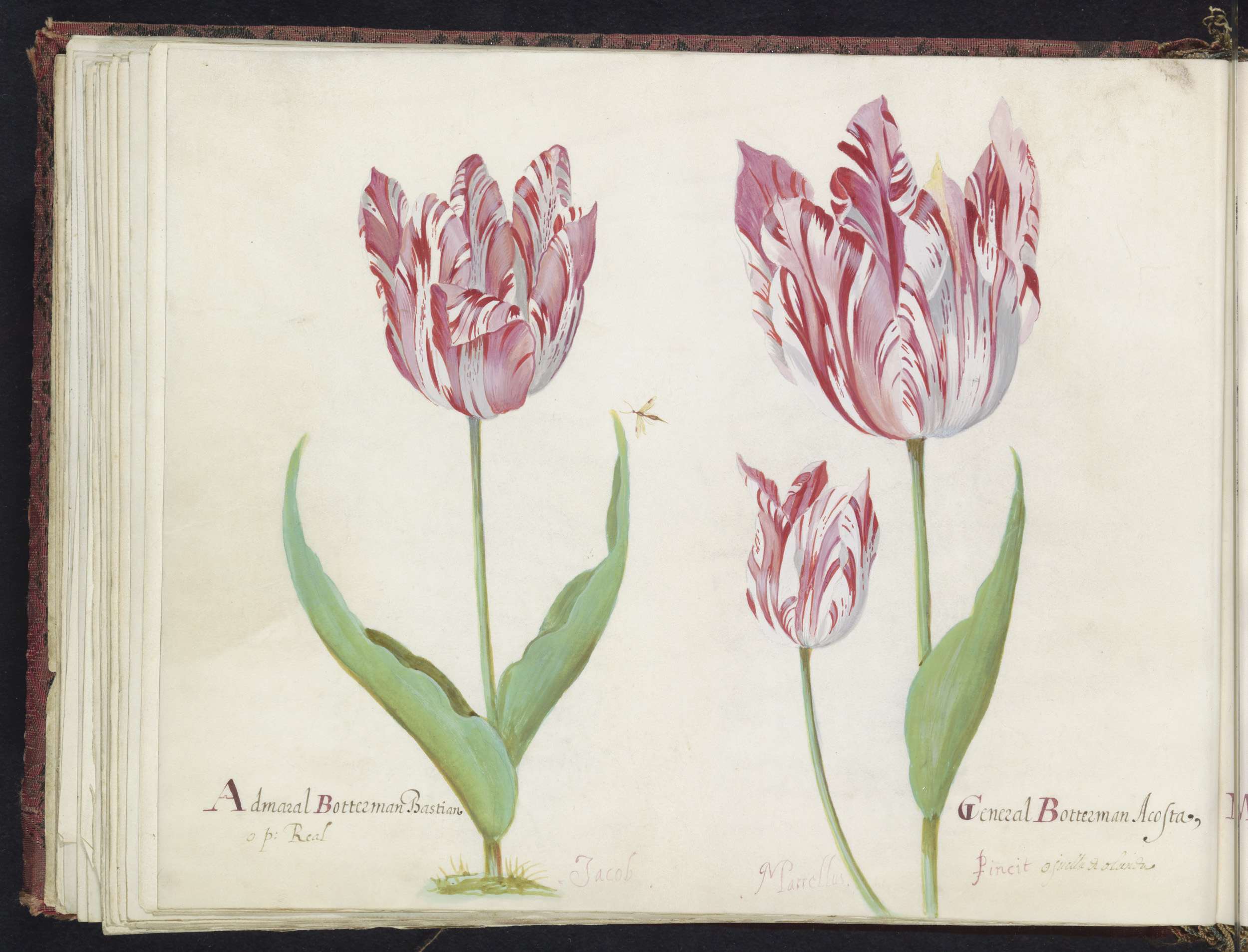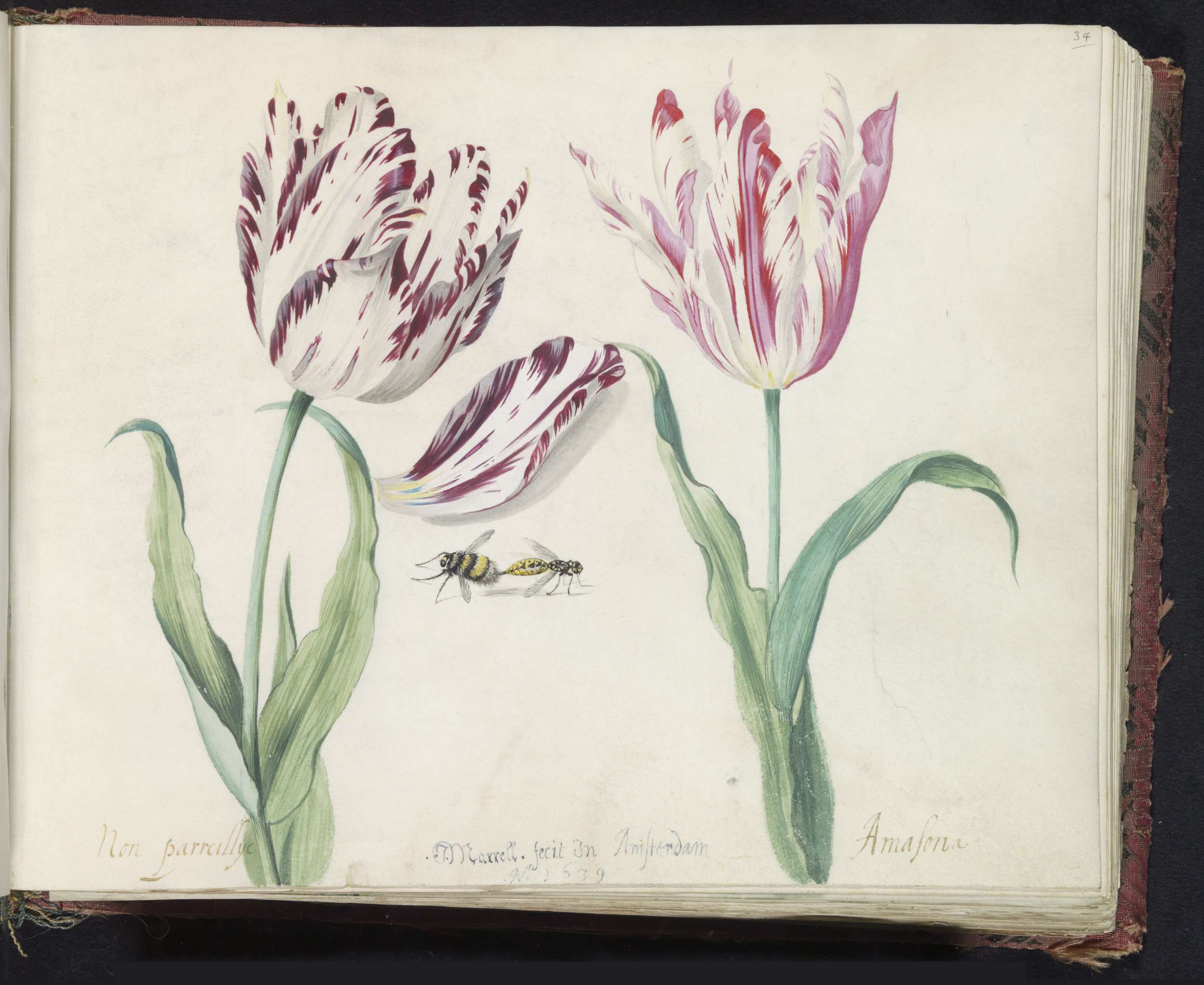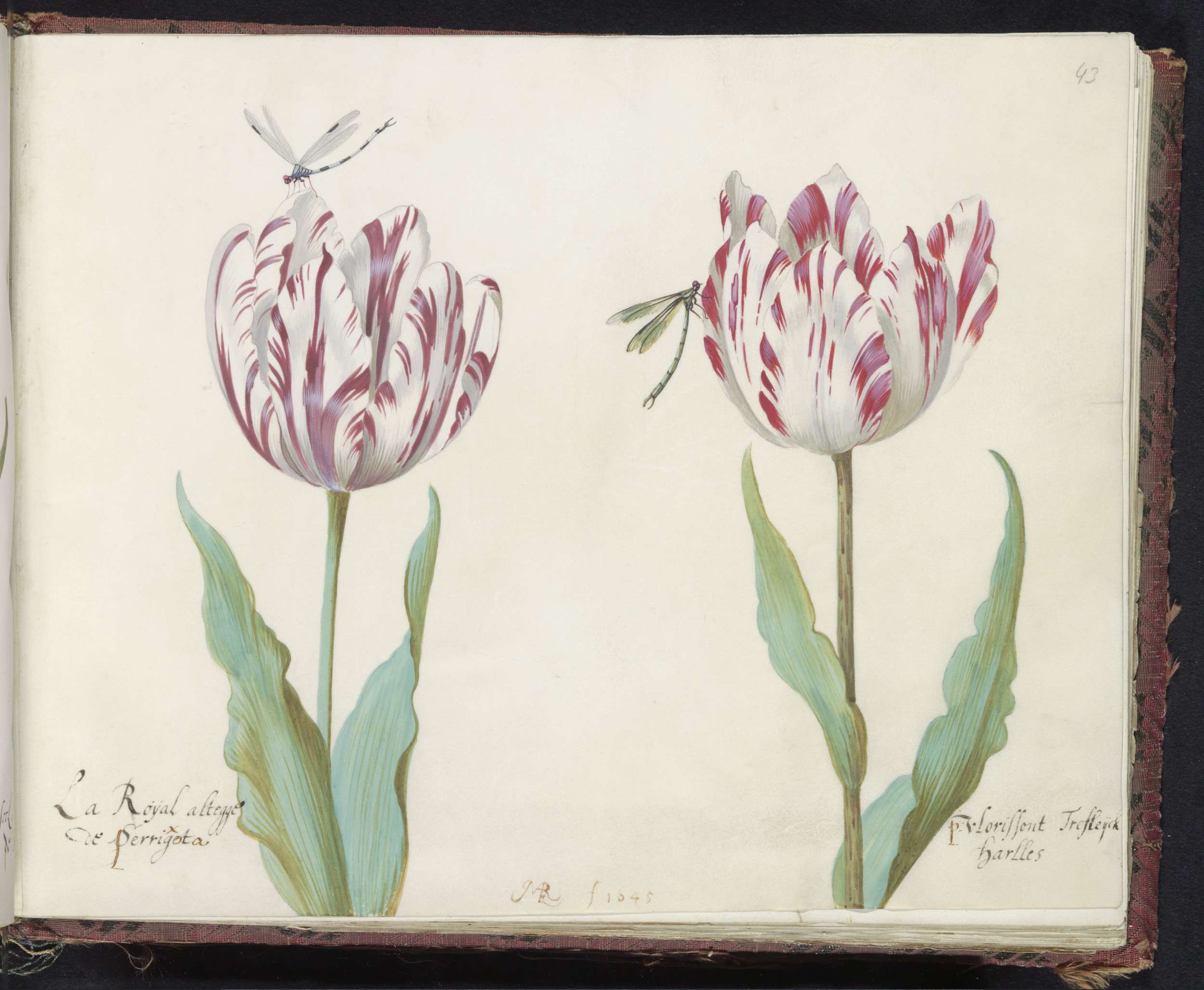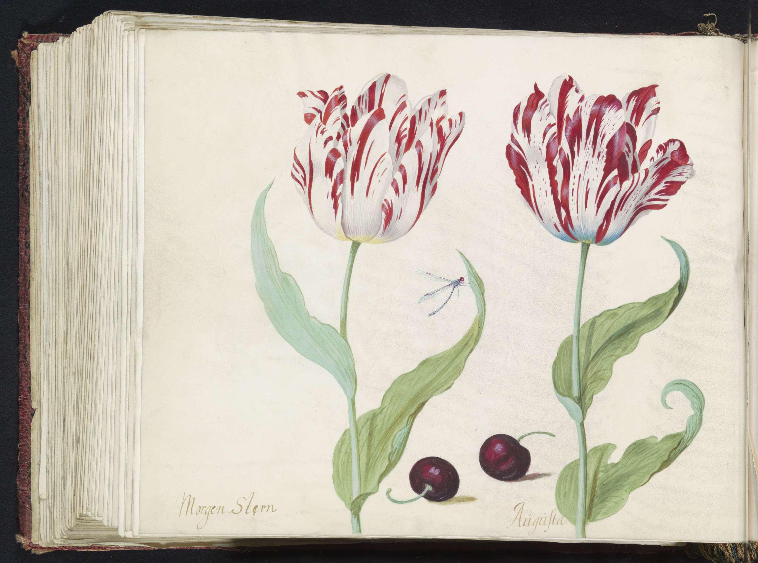 Twee tulpen met slak, nachtvlinder en twee insecten