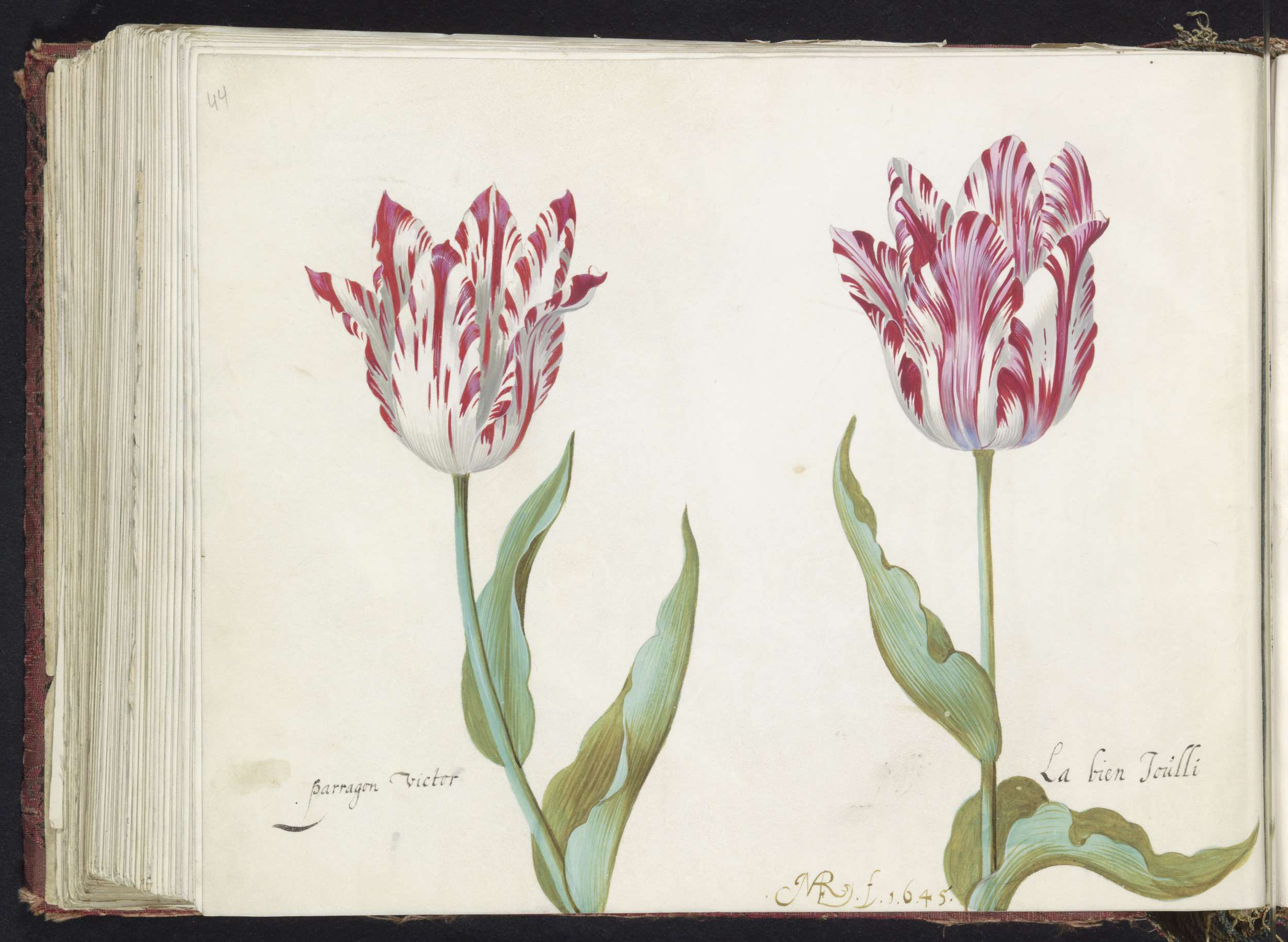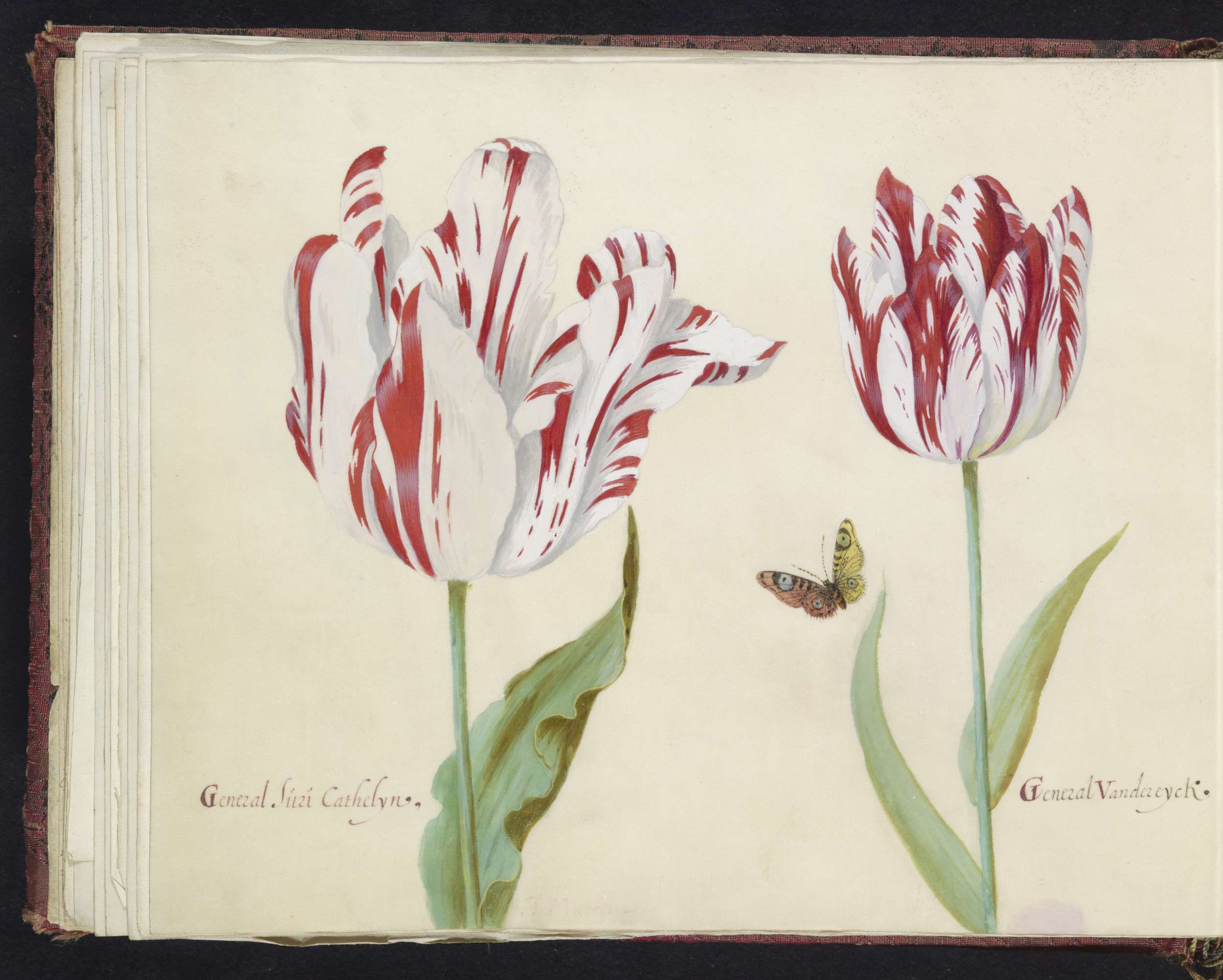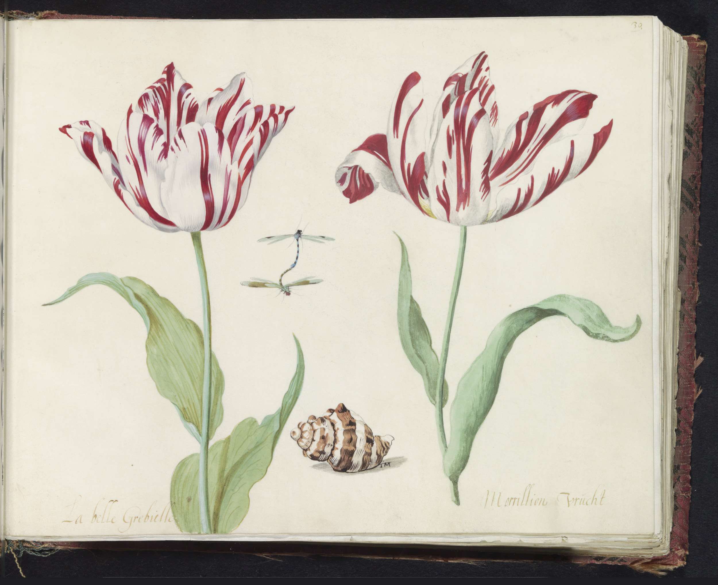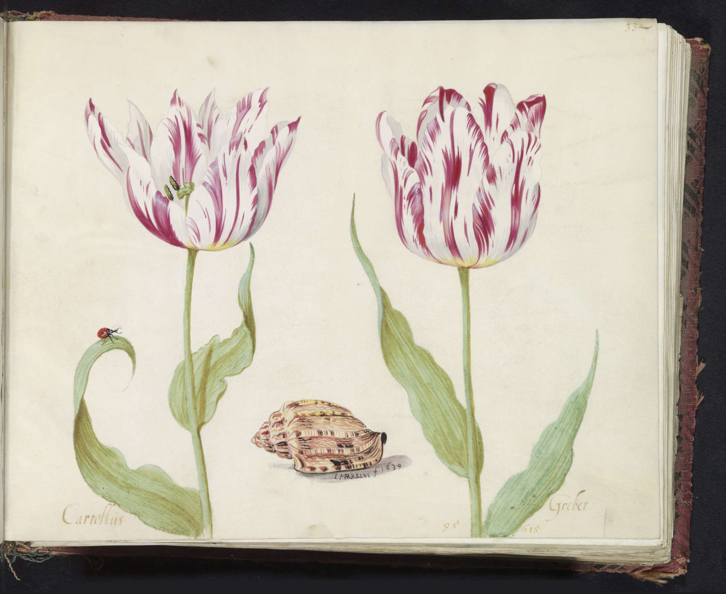 Twee tulpen met schelp, vlinder, spin en lieveheersb...