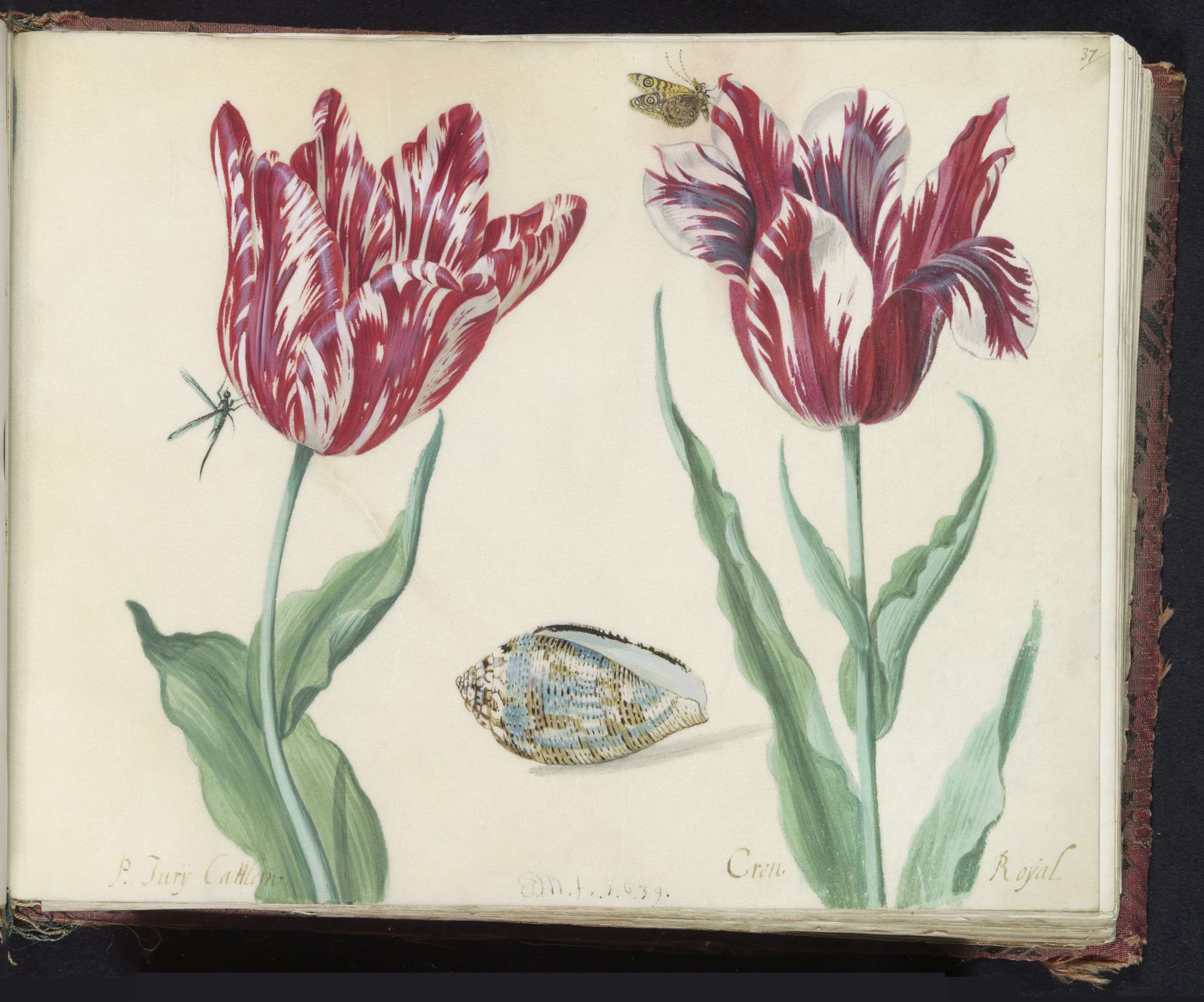 Twee tulpen met schelp, kever, vlieg en vlinder