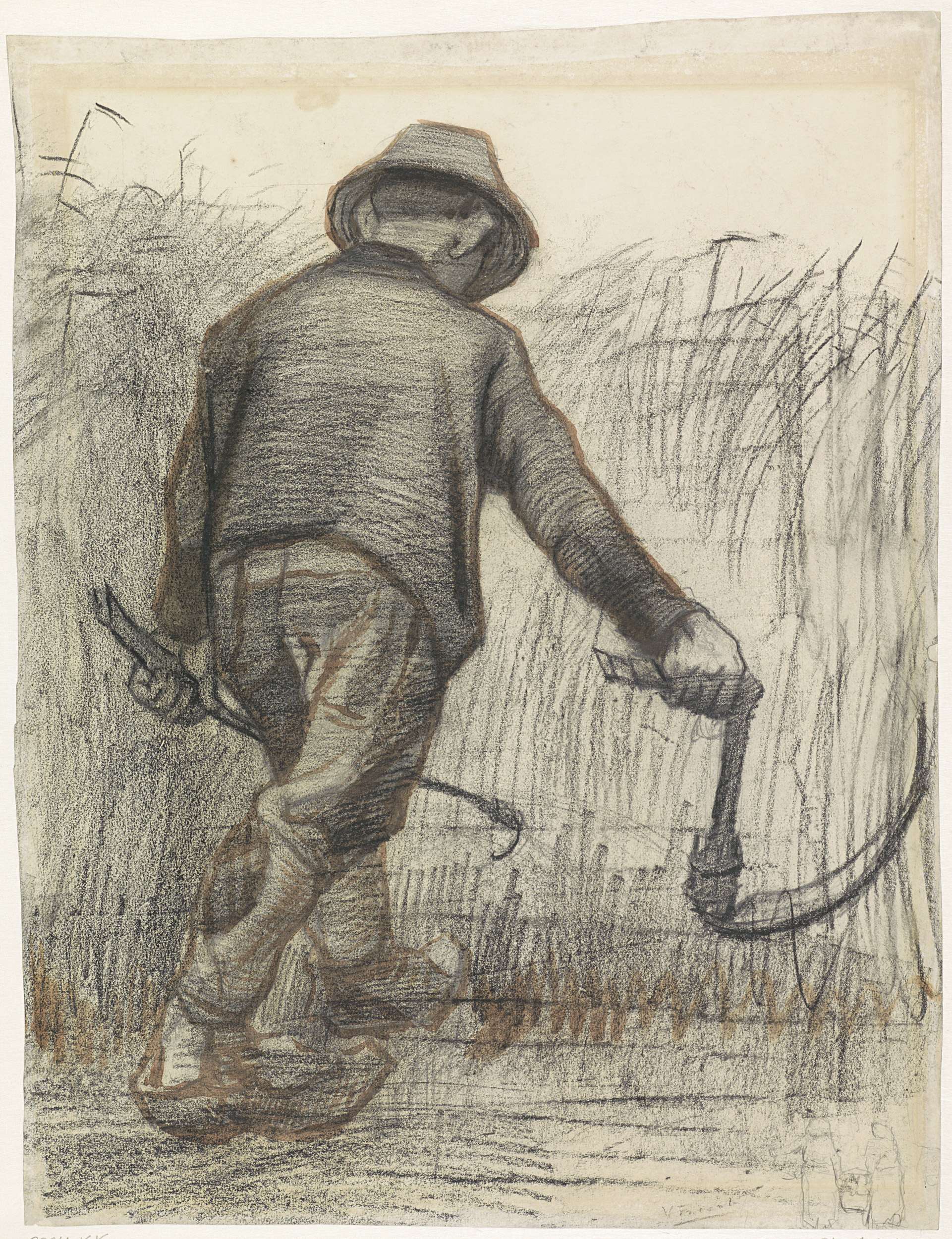 Korensnijder met hoed, van achteren gezien