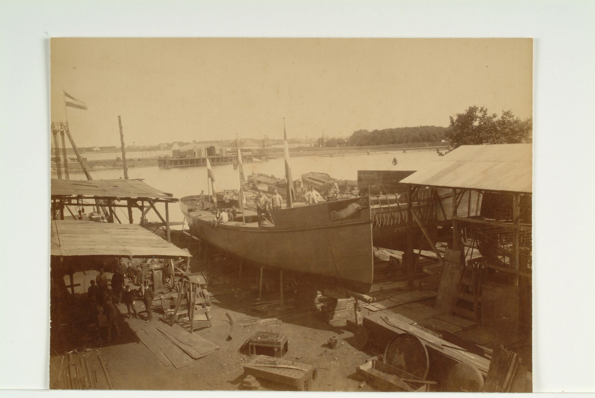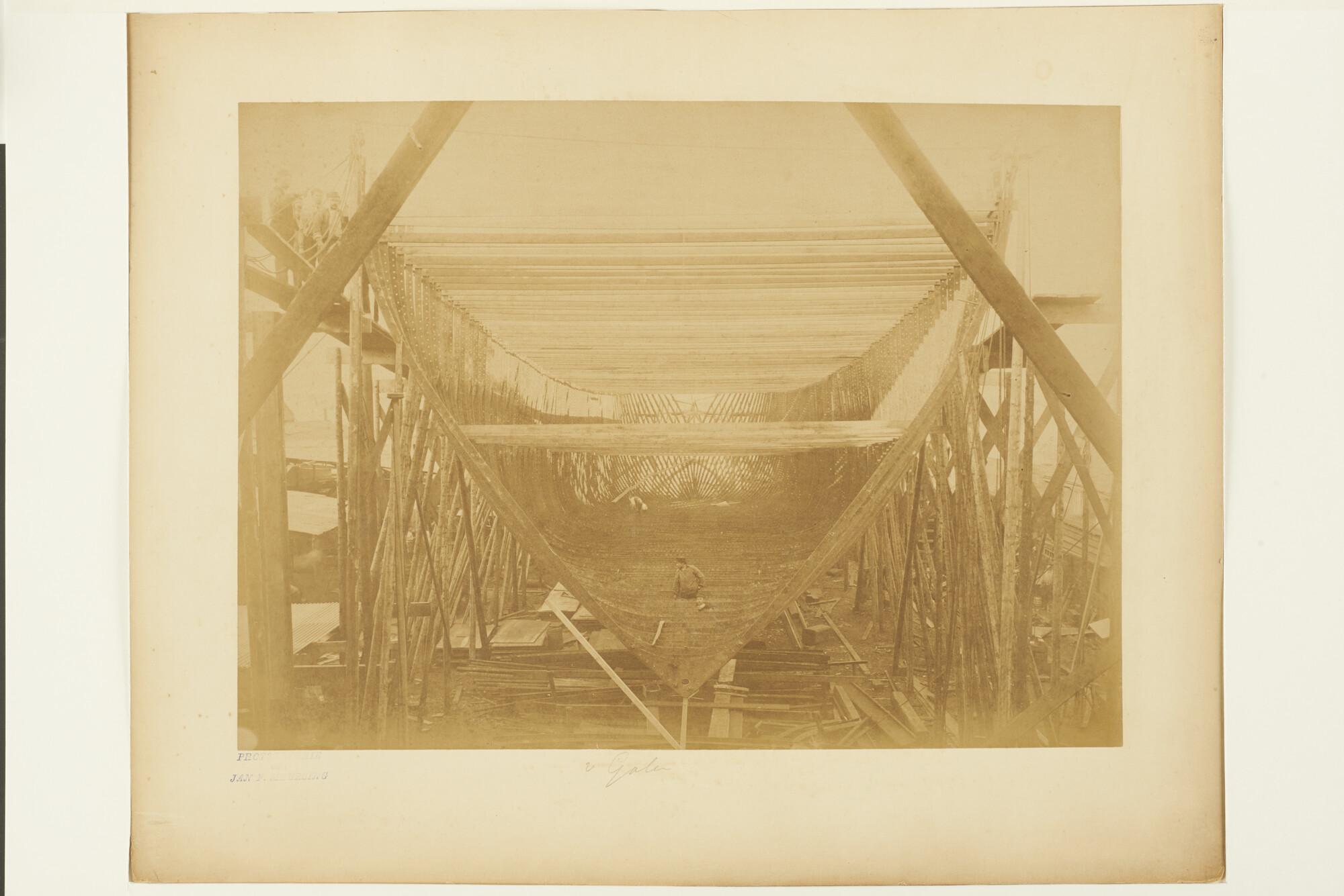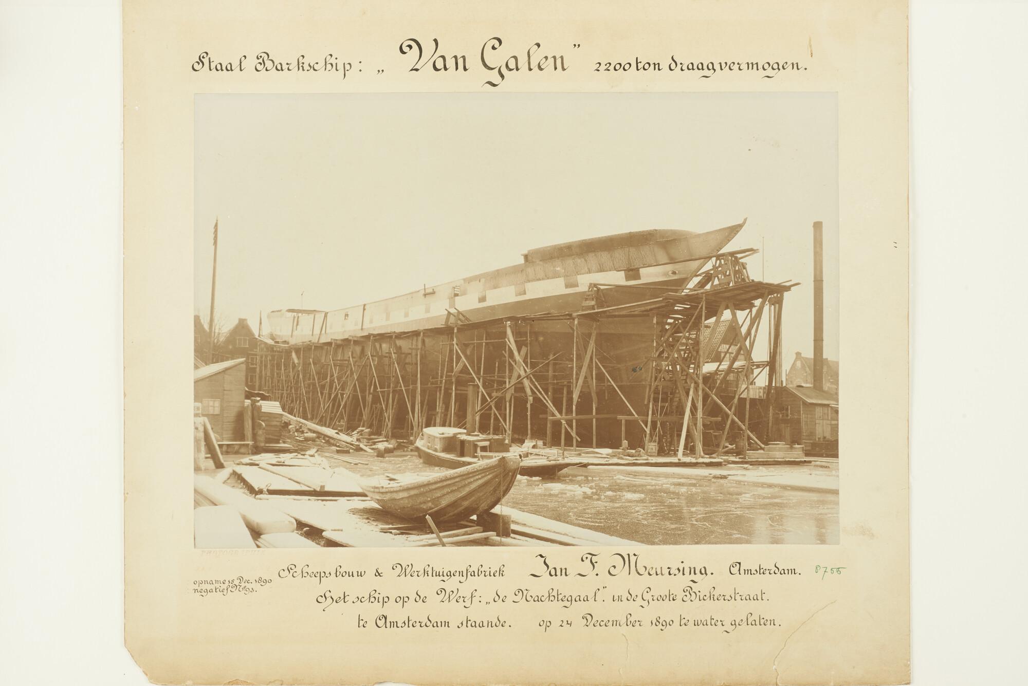 Het stalen barkschip Van Galen in aanbouw op de werf...