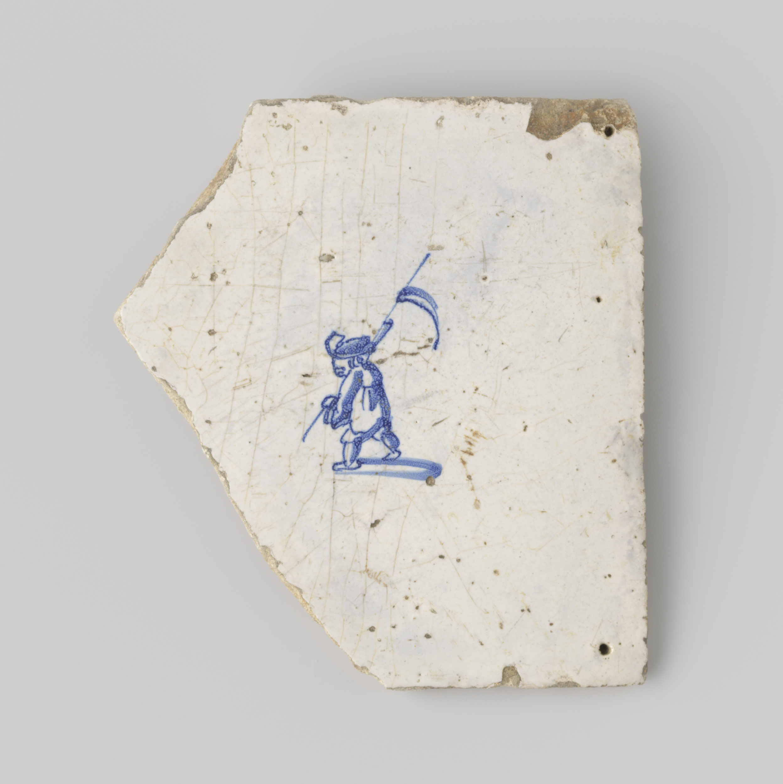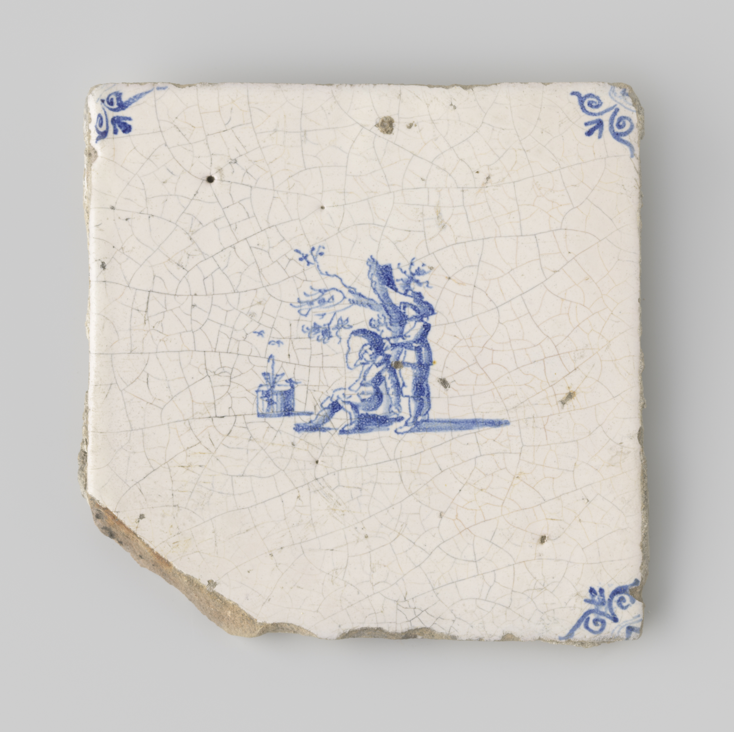 Tegel (beschadigd) voorzien van wit glazuur, waarop ...