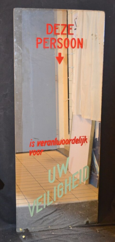 Langwerpige spiegel van glas met tekst ca. 1970-2005
