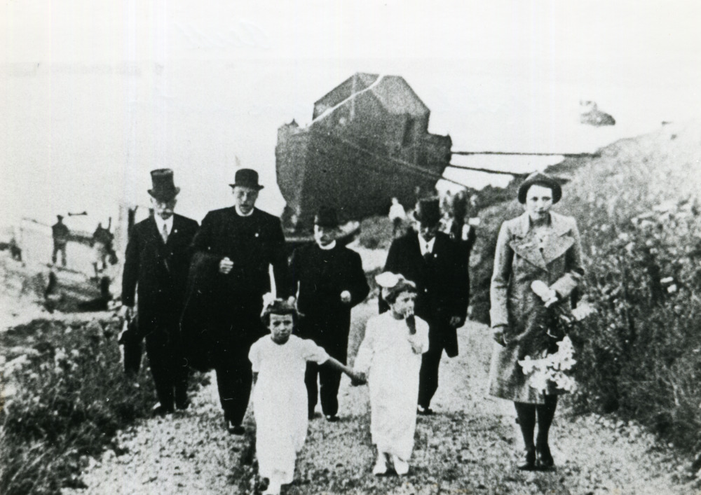 Zwart-wit foto van het inhalen van de pastoor in Her...