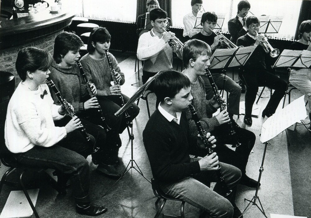 Zwart-wit foto van het jeugdorkest in Herwen door He...
