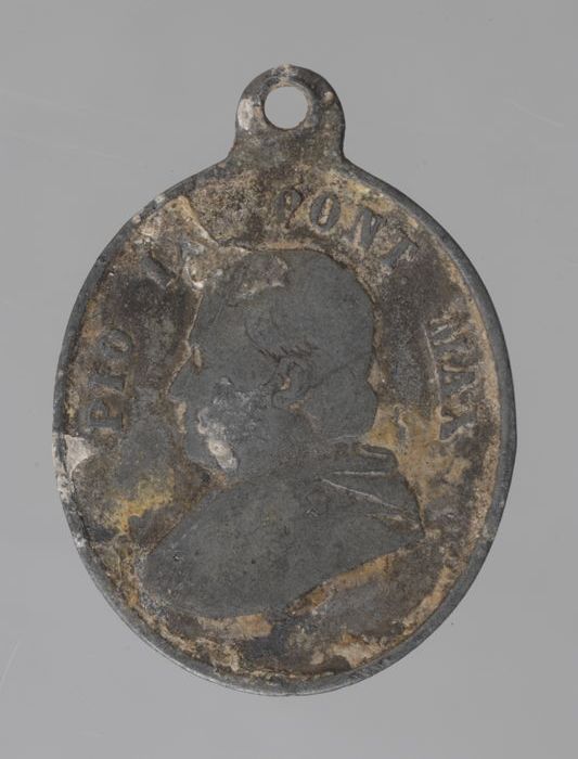 Verbrande ovale religieuze draagpenning met afbeeldi...