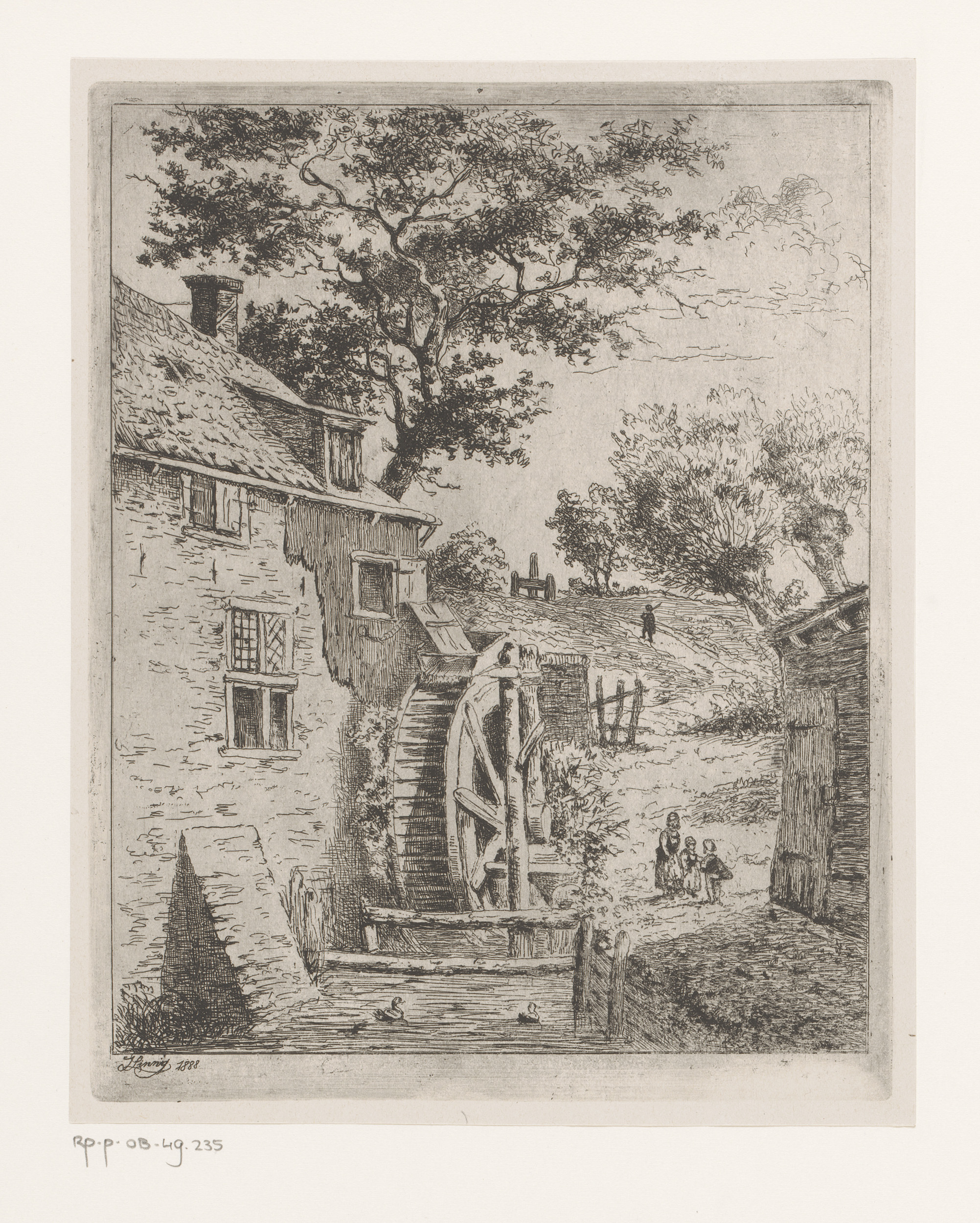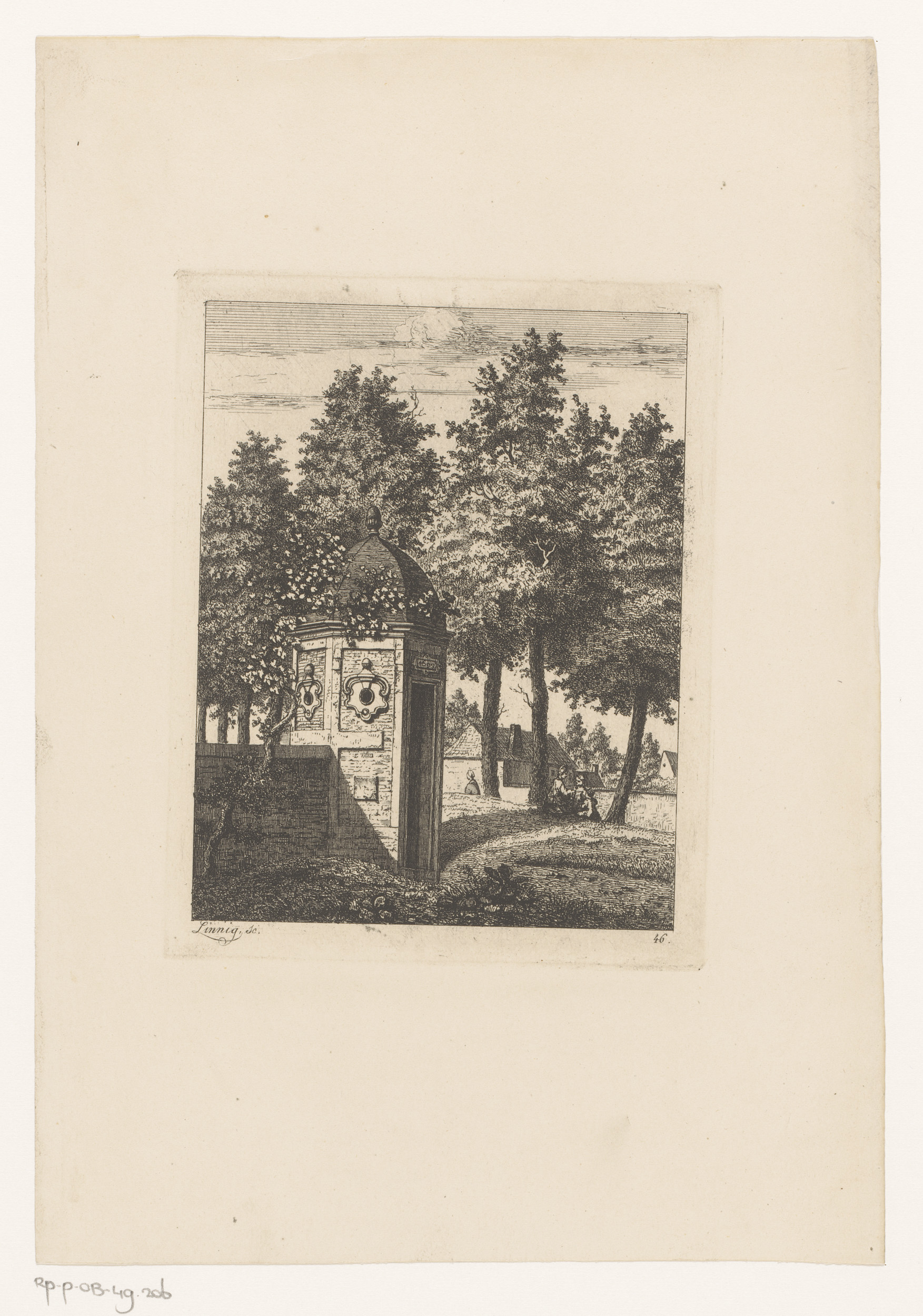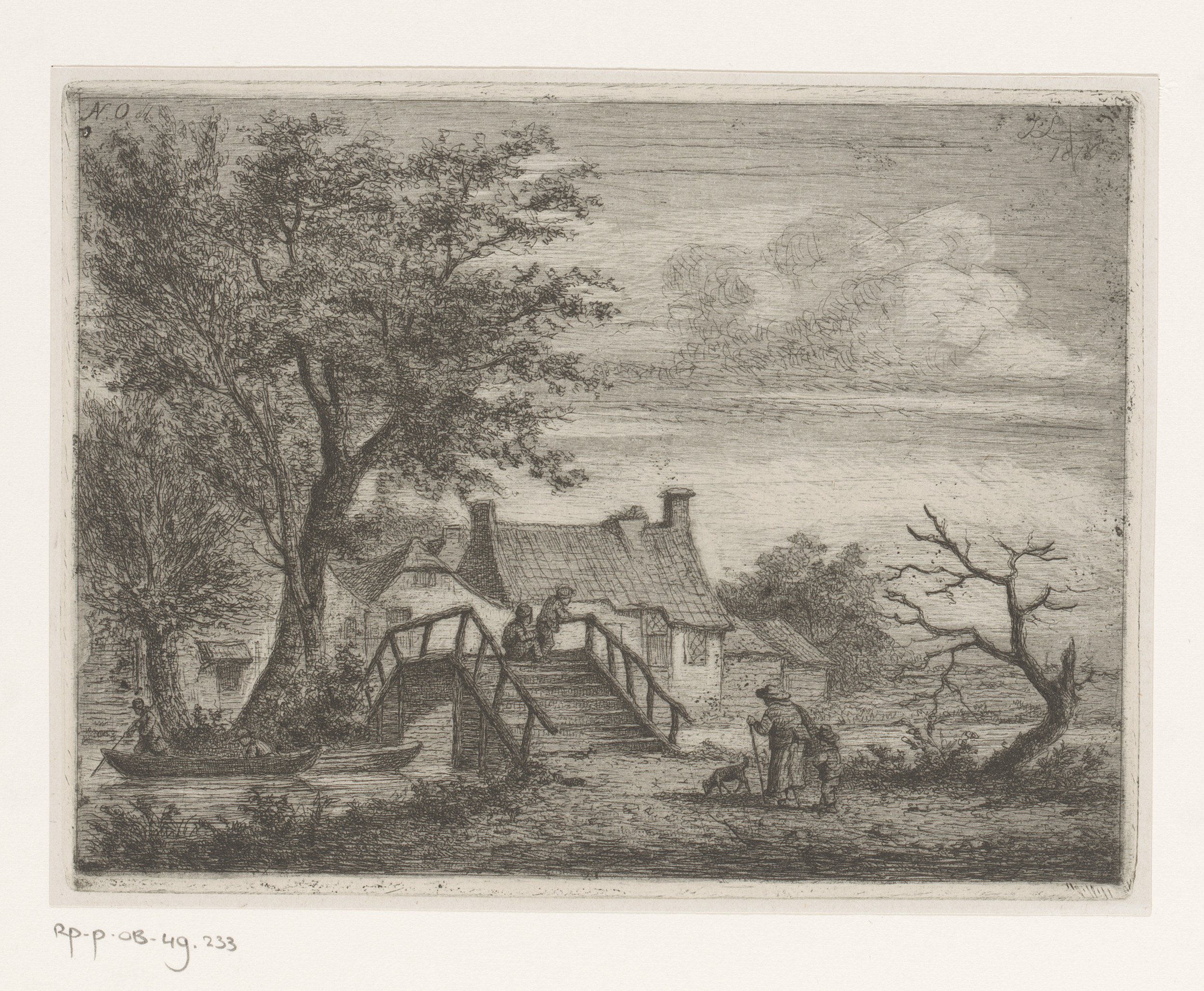 Landschap met vier figuren bij een boerderij
