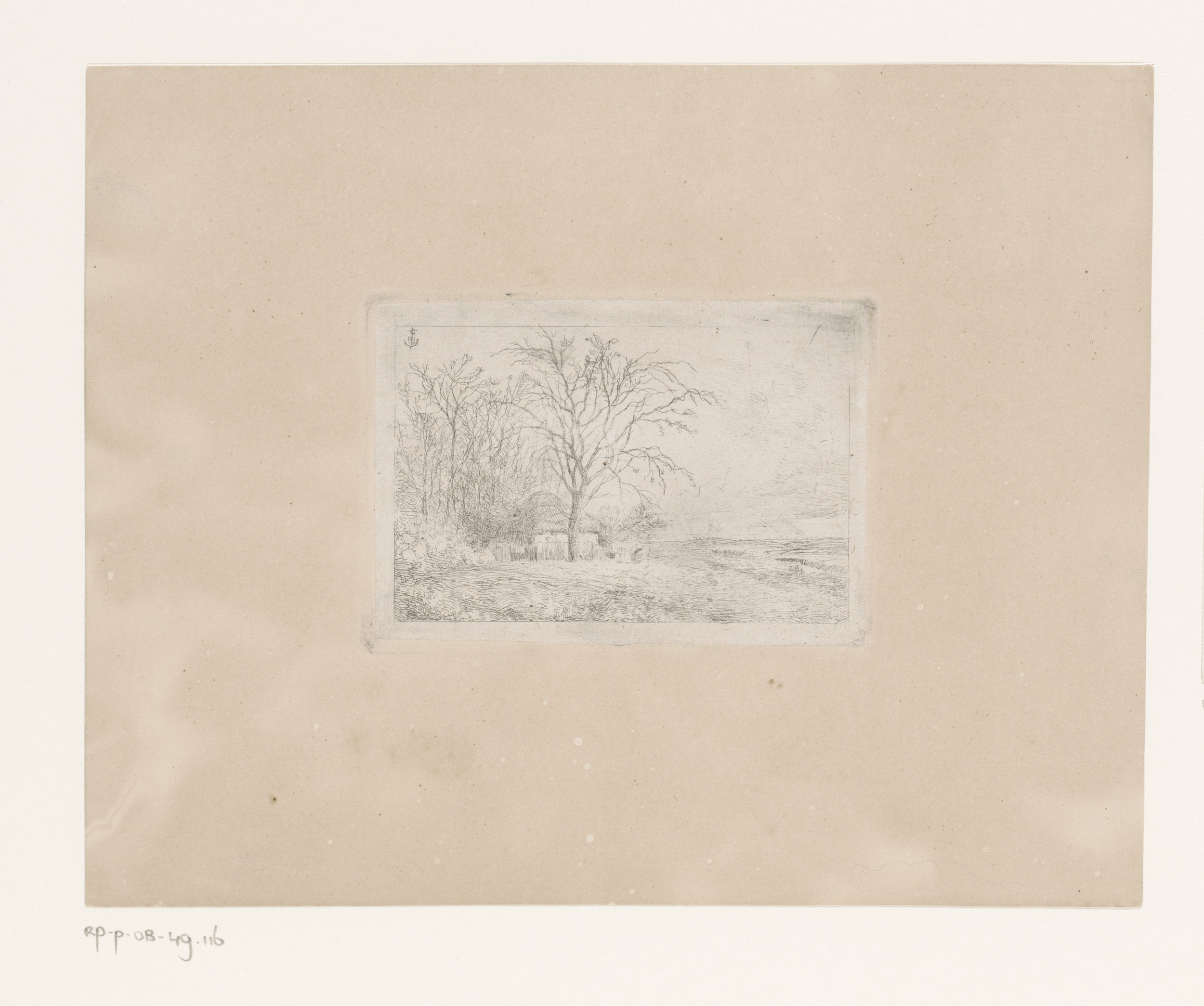 Landschap met een klein gebouw tussen kale bomen