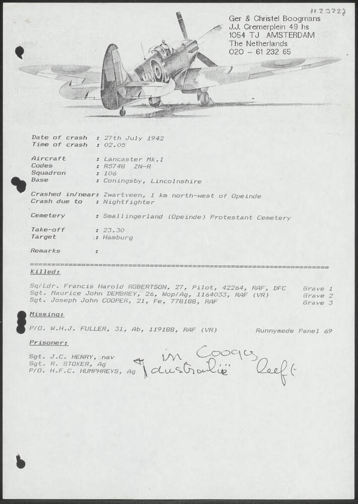 Verslagen/rapportern over neerstorten van Lancaster ...