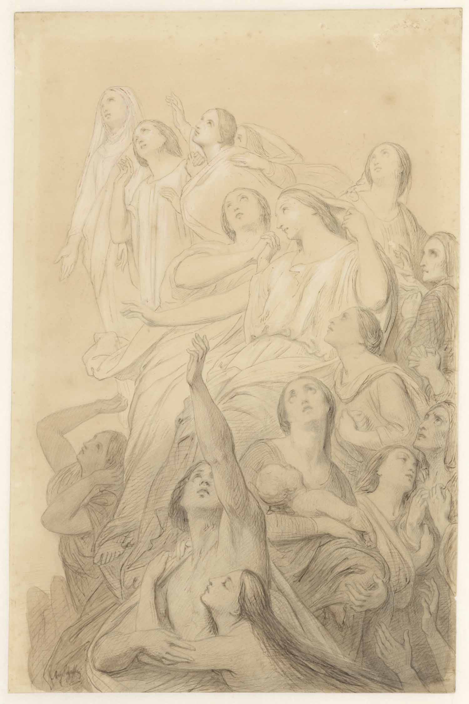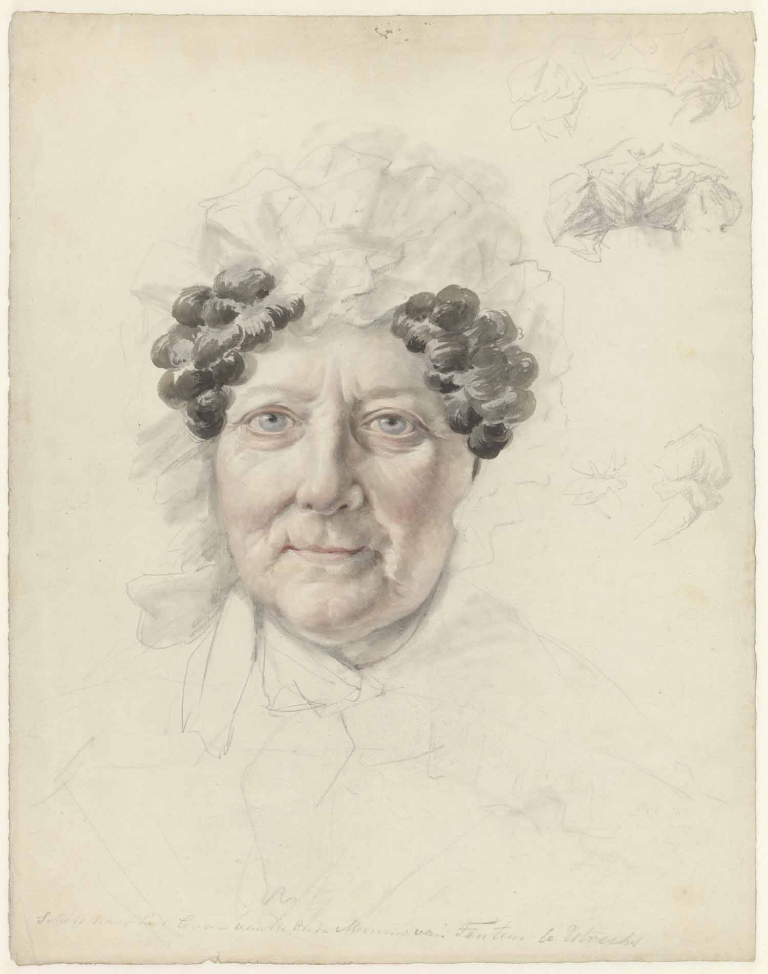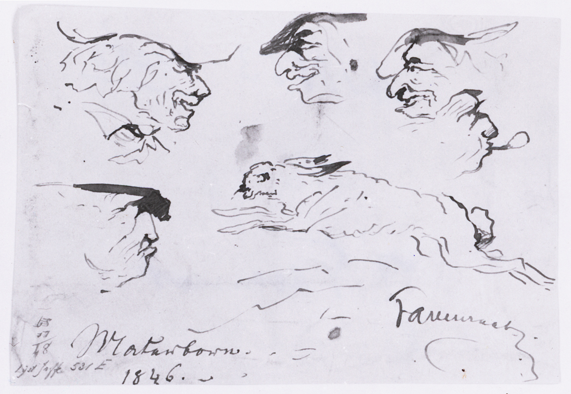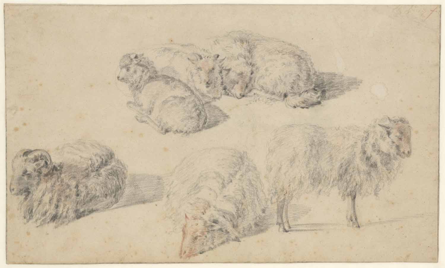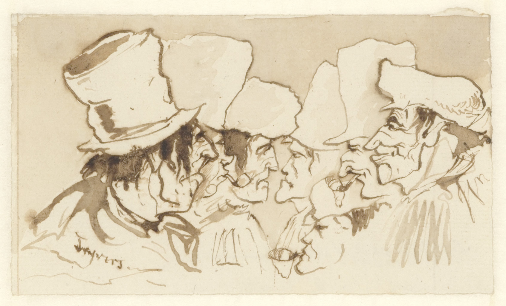 Schetsen van vijf hoofden en een haas. Studie van tw...