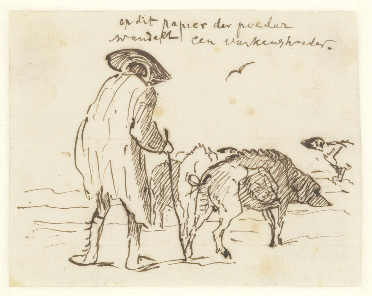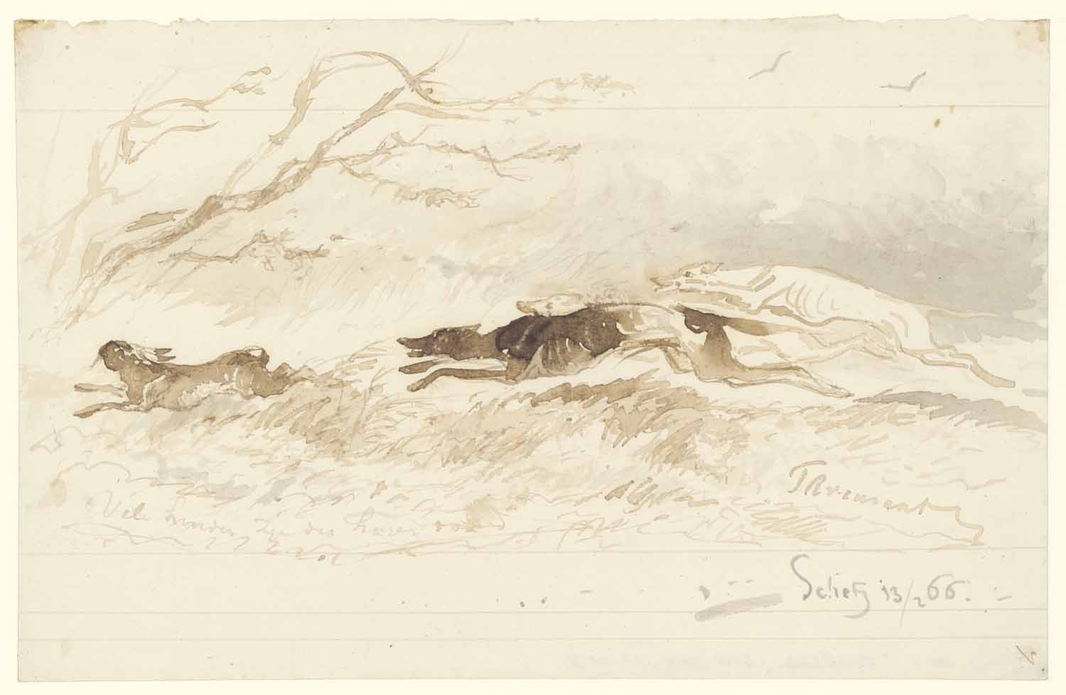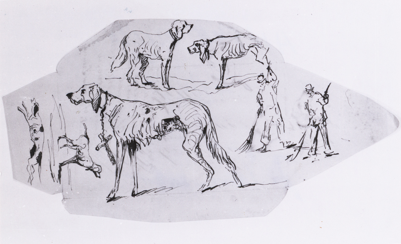 Schetsen van vijf honden en twee mannen. Drie hondek...