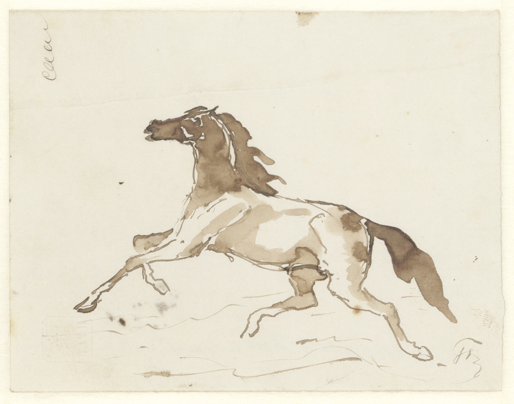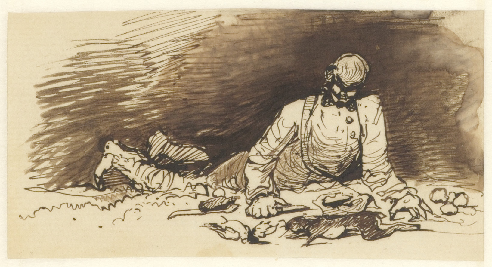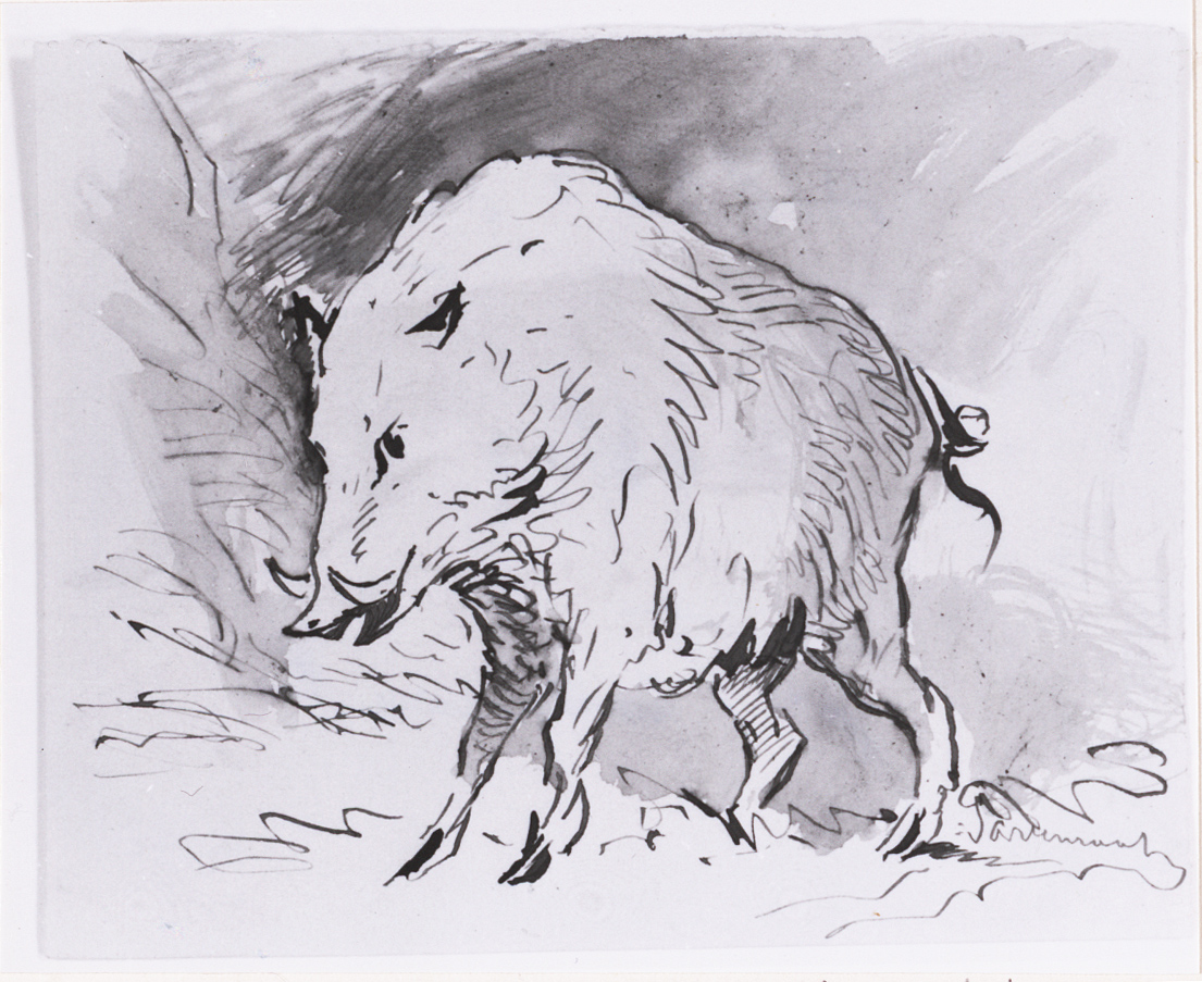 Schetsen van vijf honden en twee mannen. Drie hondek...
