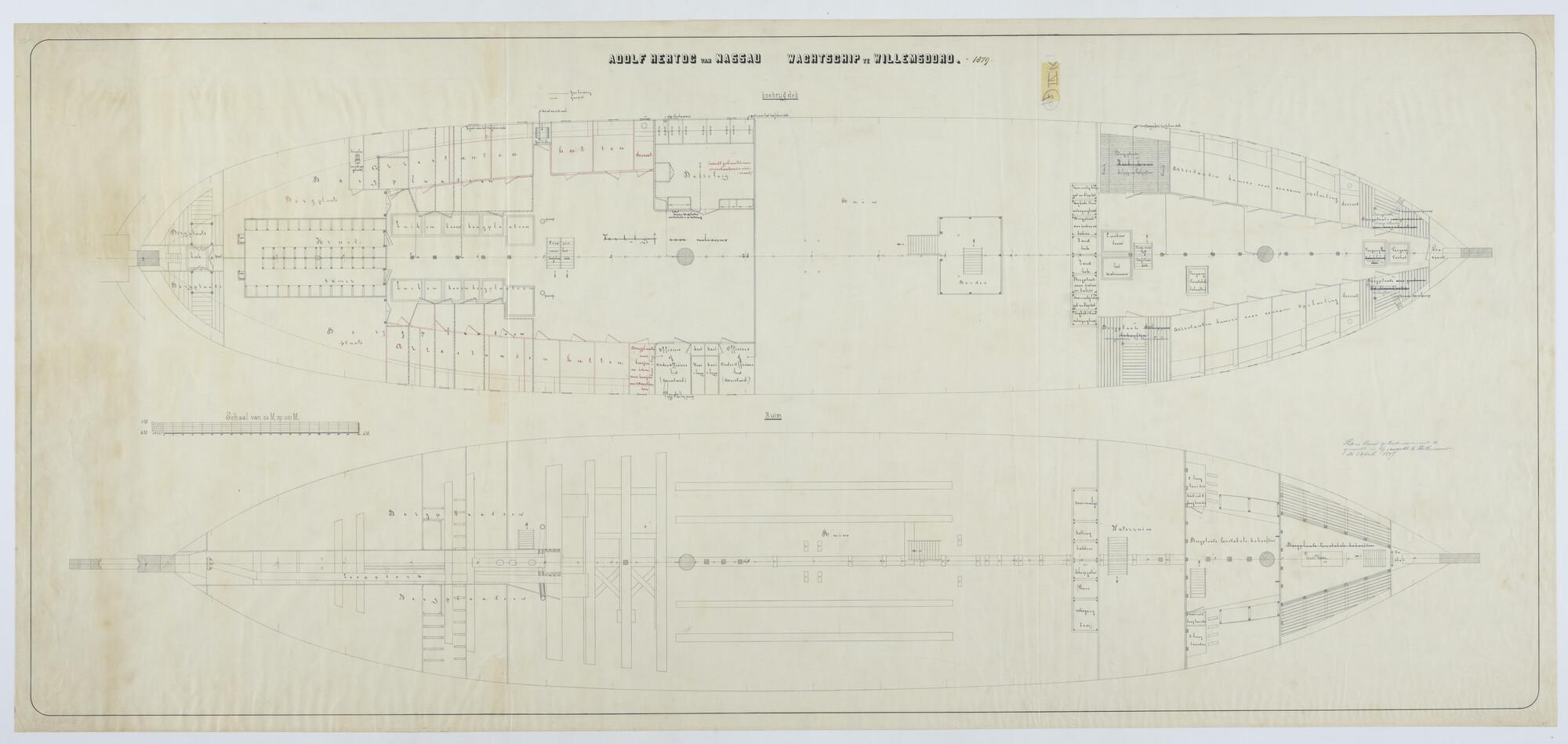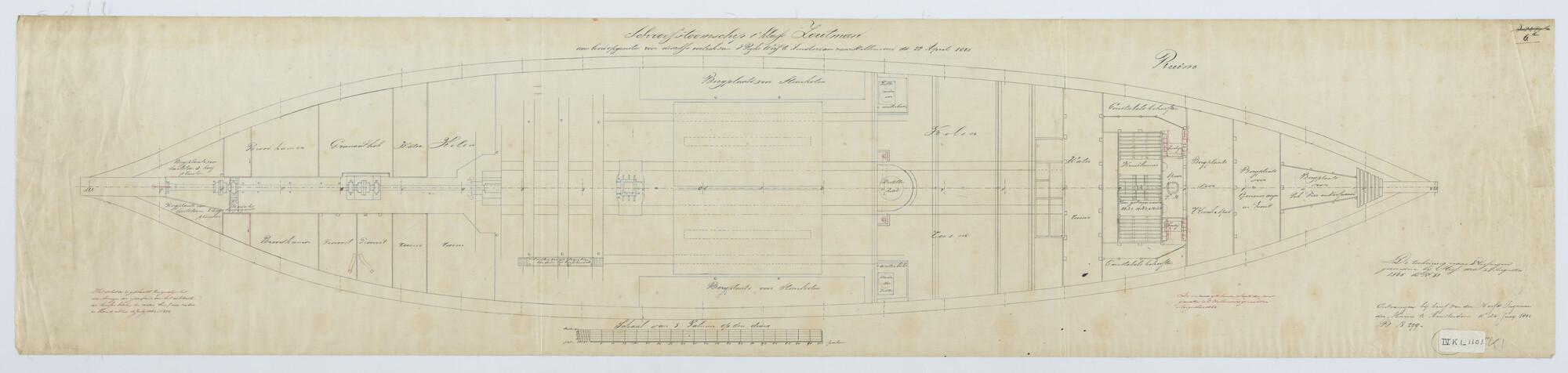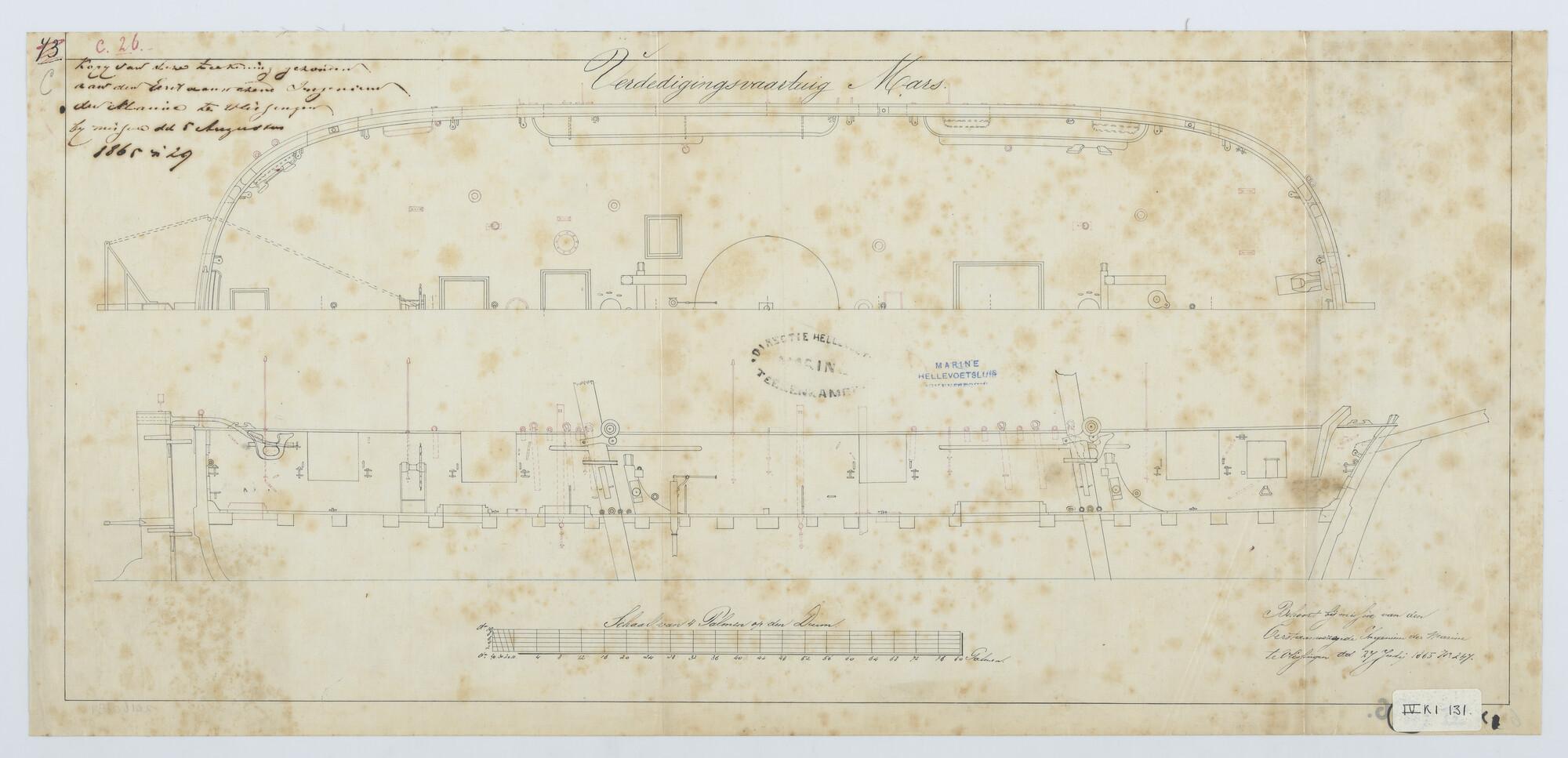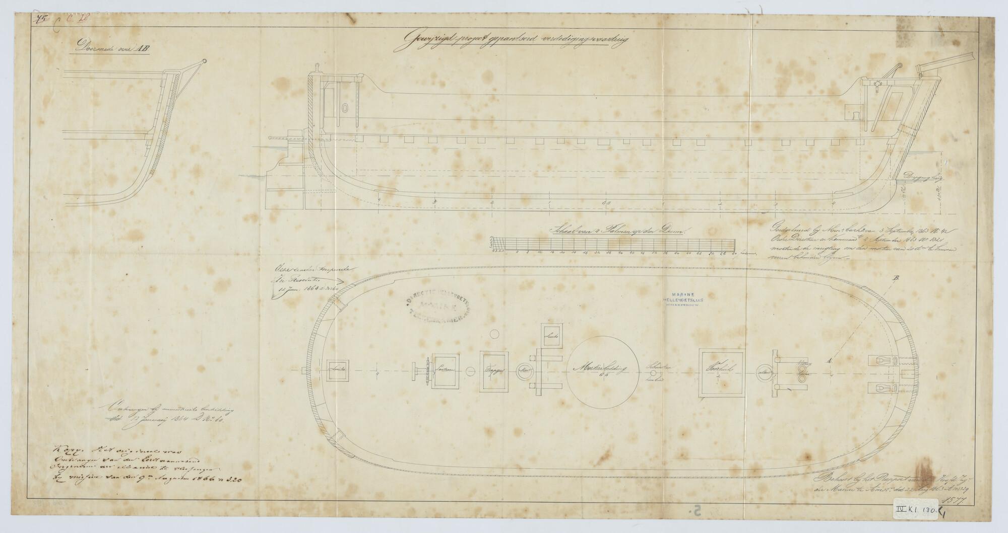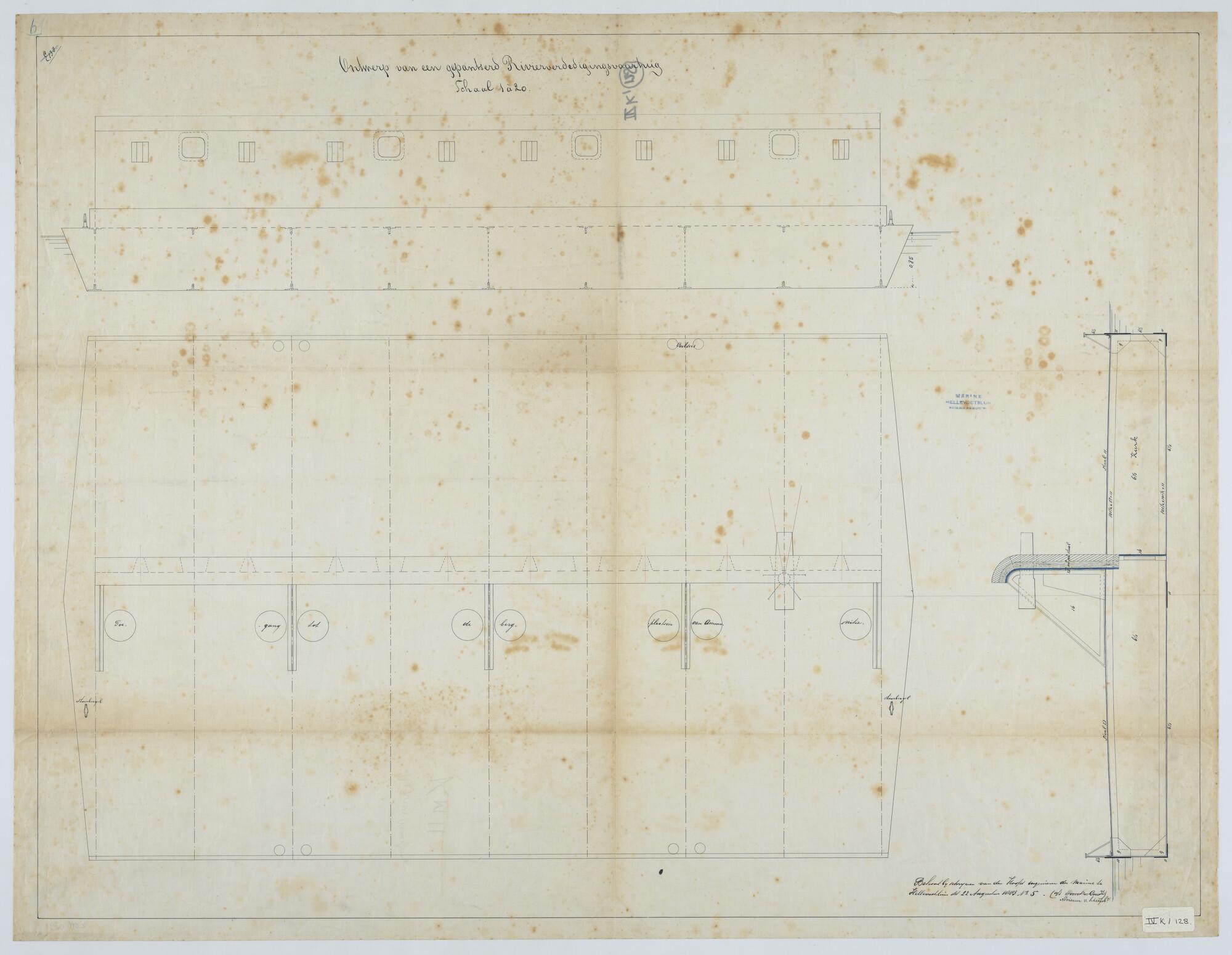 'Verdedigingsvaartuig, 1883'. zijanzicht, bovenaanzicht