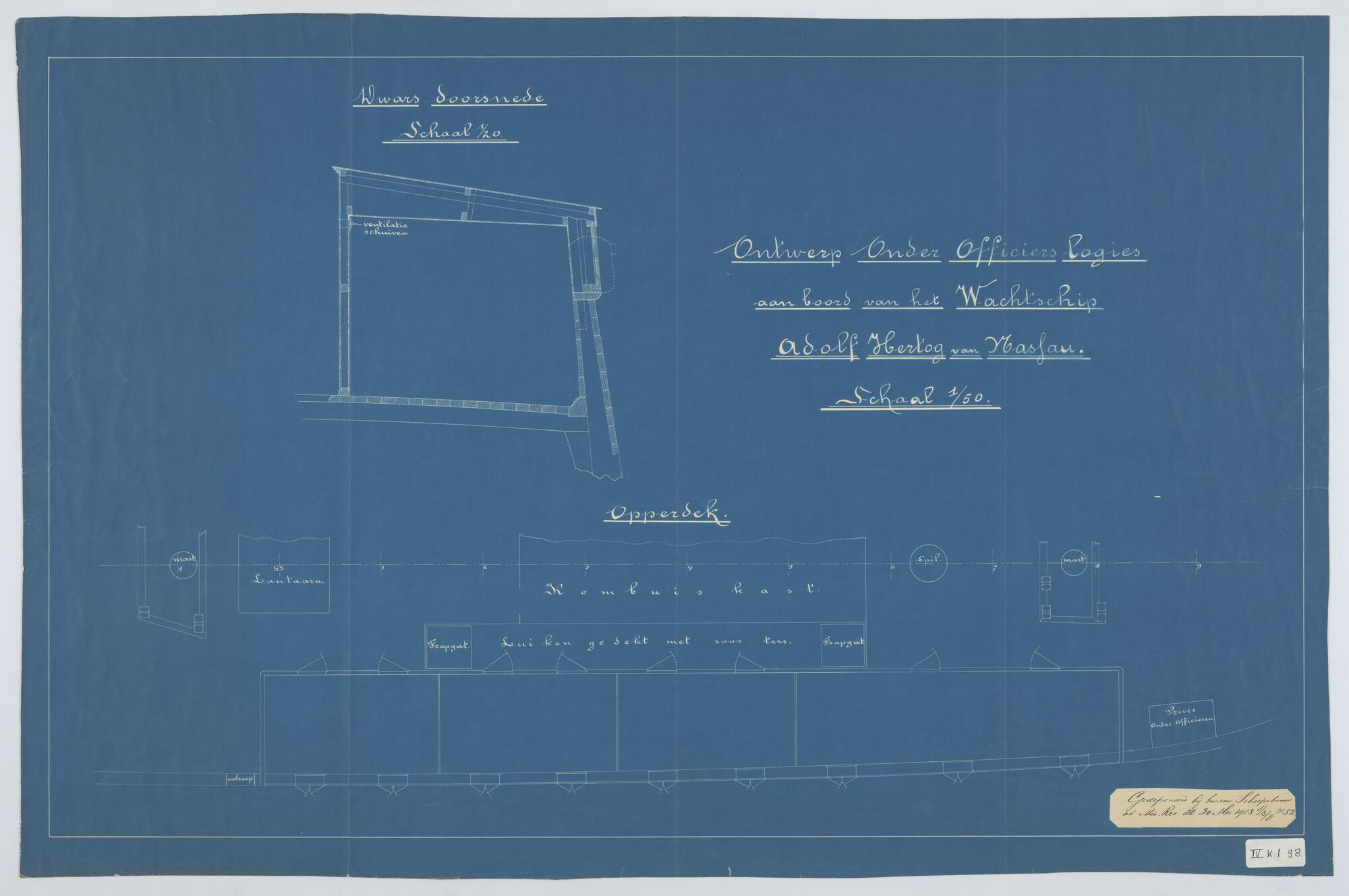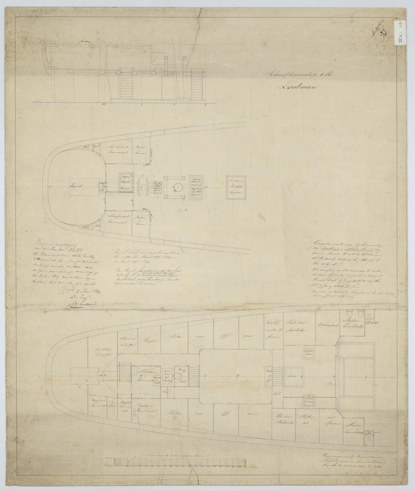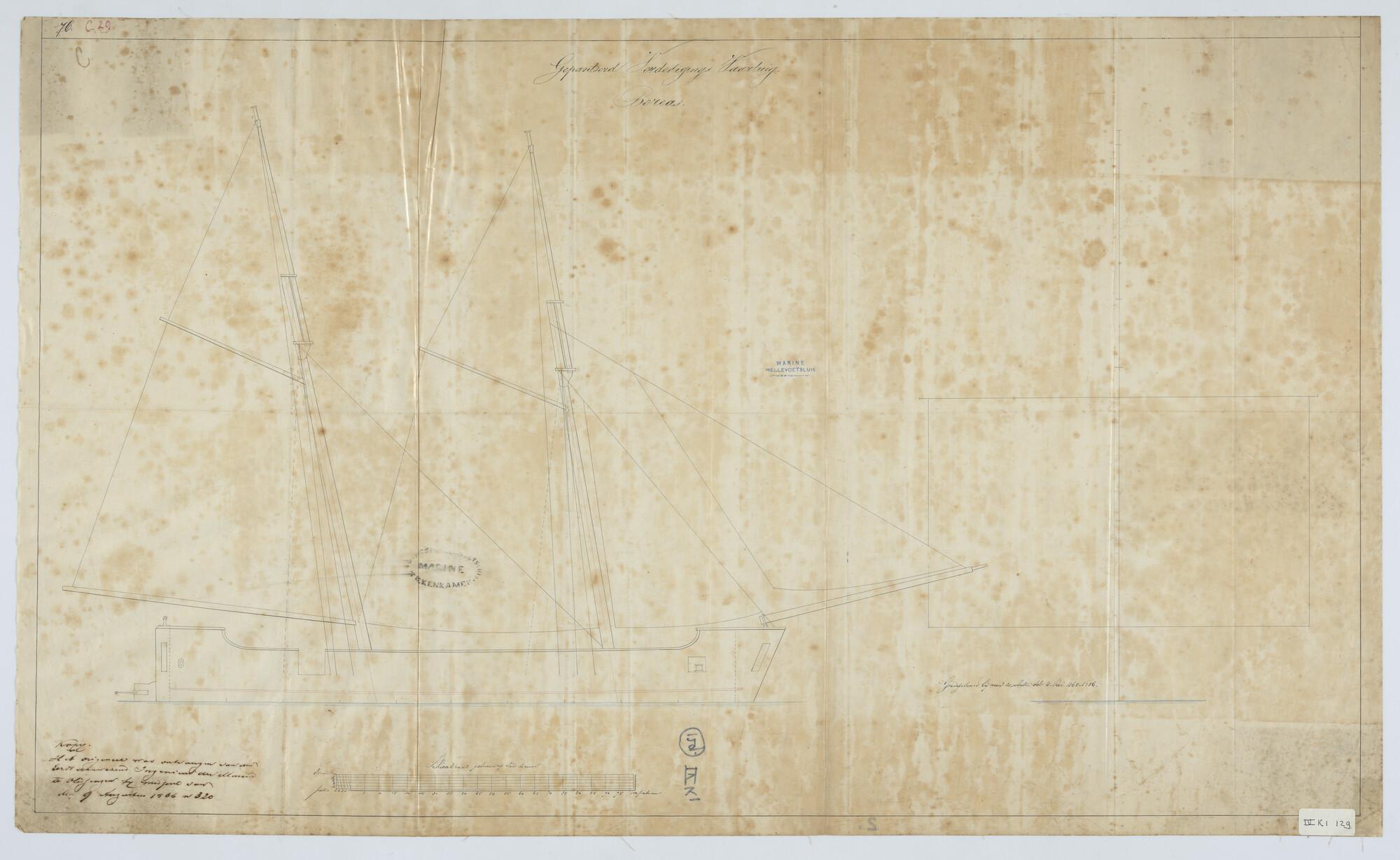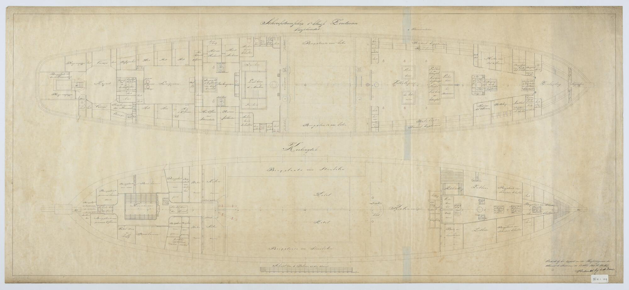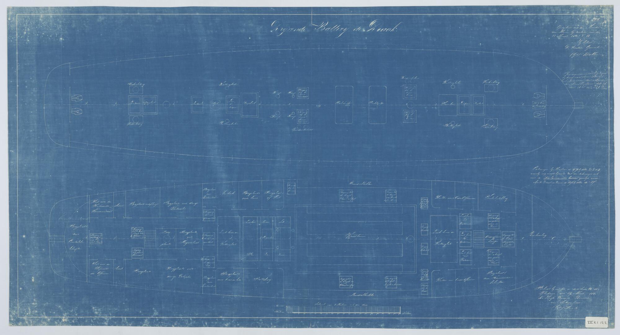 'Verdedigingsvaartuig, 1883'. zijanzicht, bovenaanzicht