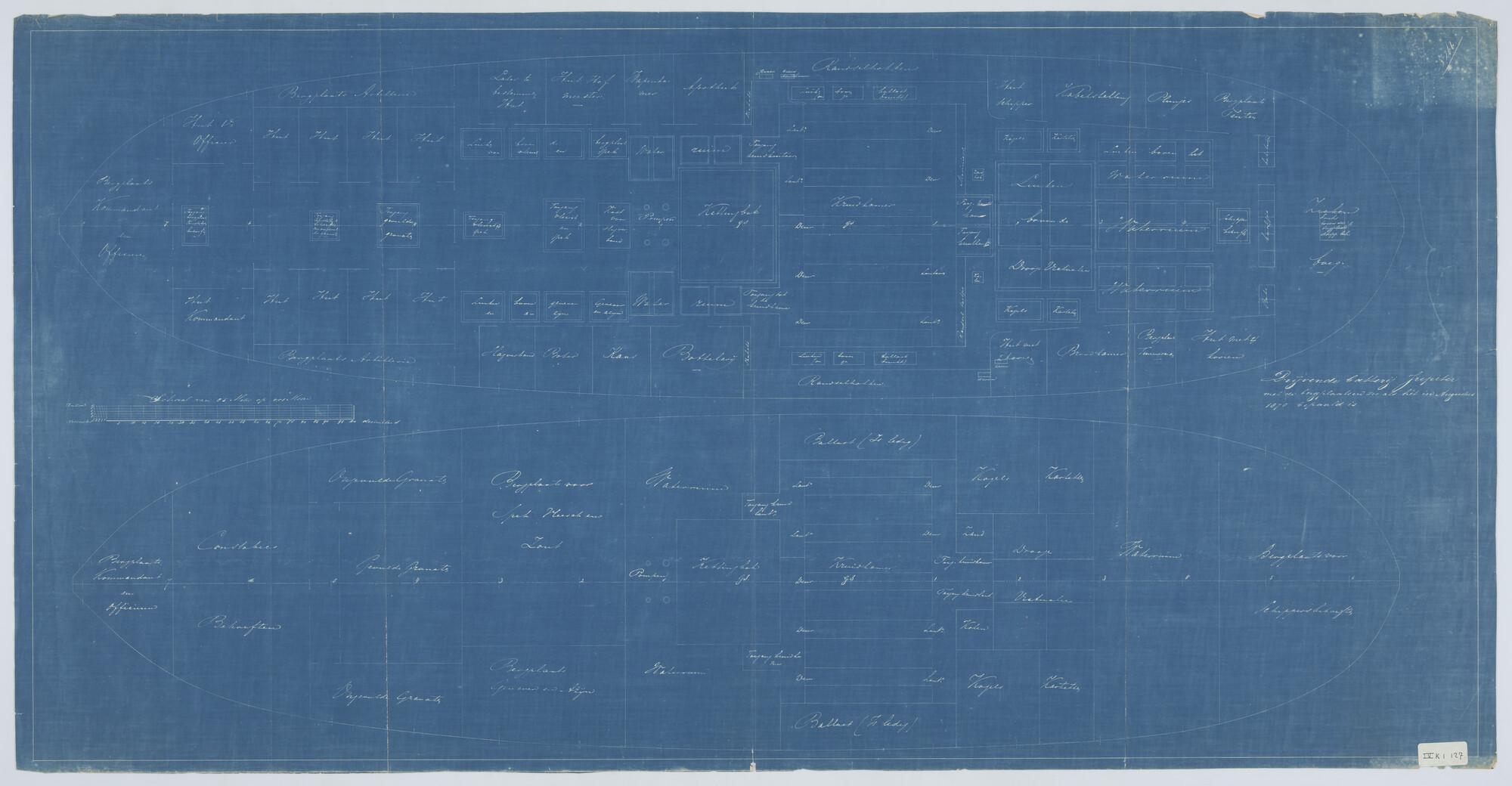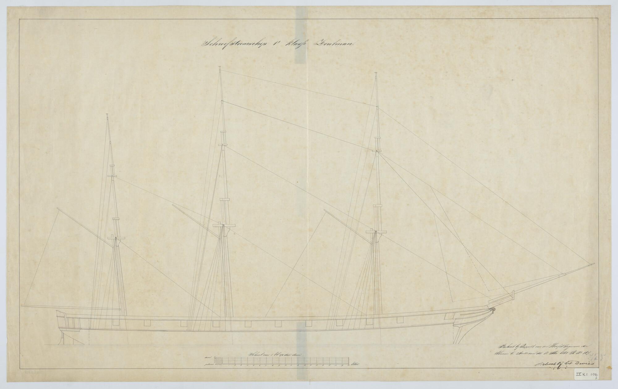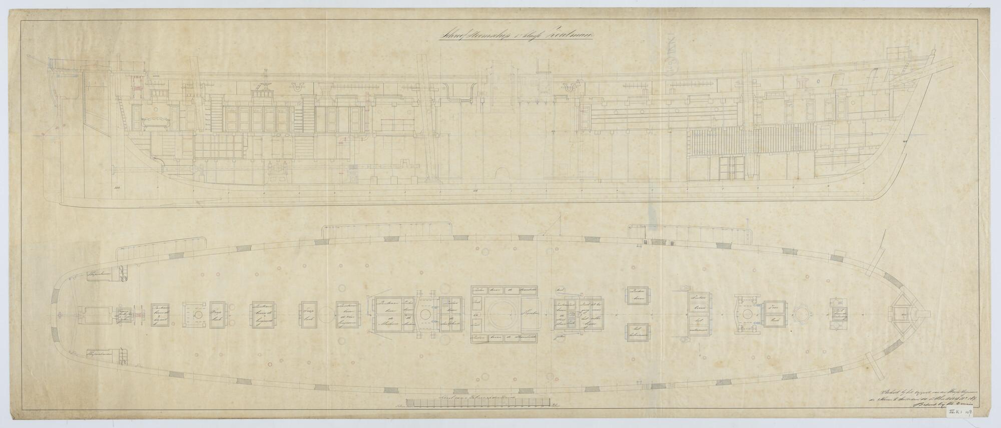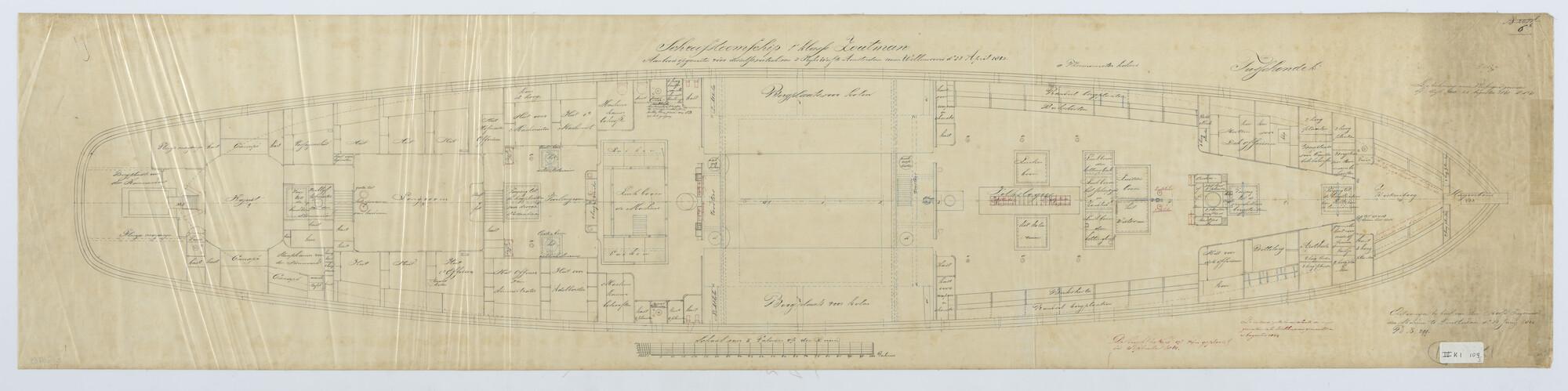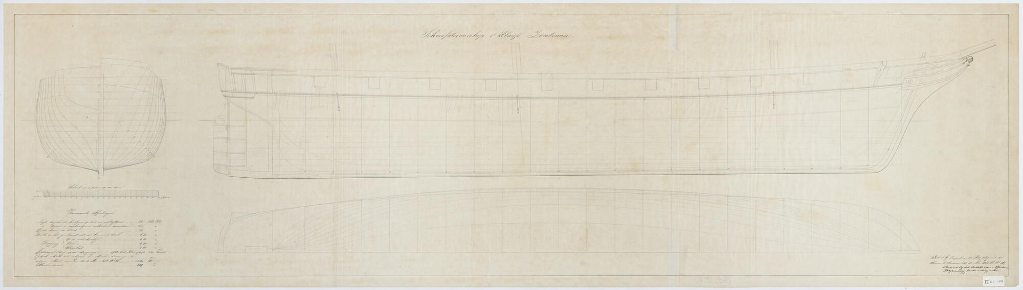 'Verdedigingsvaartuig, 1883'. zijanzicht, bovenaanzicht