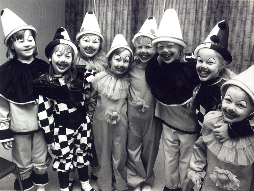 Zwart-wit foto van de vrolijke clowns van de jeugdca...
