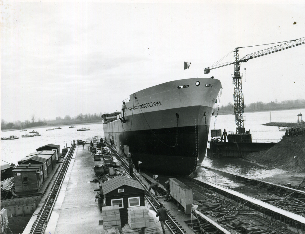 Zwart-wit foto van de tewaterlating van de Deepwater...