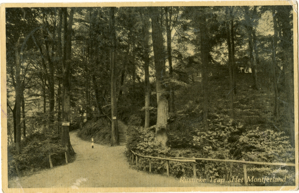 Zwart-wit foto van de rustieke trap naar het hotel '...