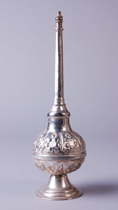 Zilverkleurige flacon met lange hals, wordt gebruikt...