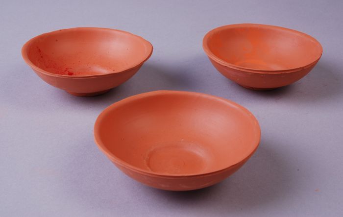 Drie terracotta kommen, behorende als attributen bij...