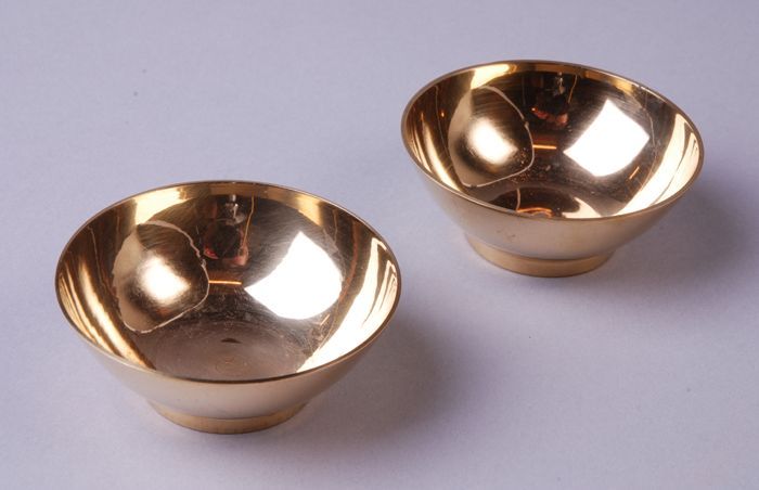 Twee kleine, koperen kommen, behorende als attribute...