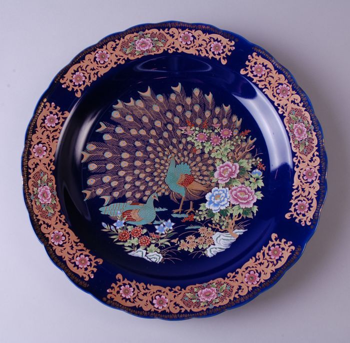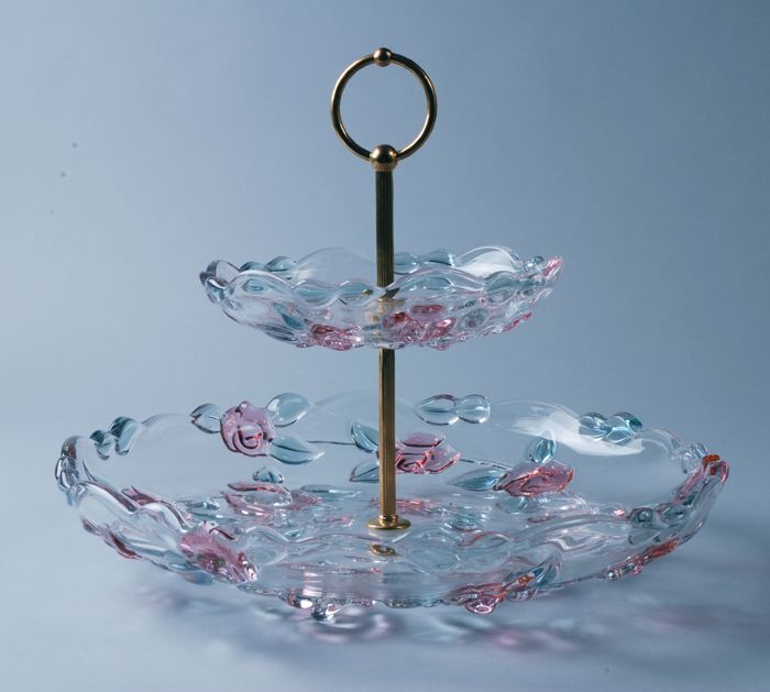 Glazen schaal met plateau, versierd met gekleurde ro...