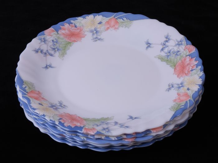 Zes glazen borden met bloemdecor op de vlag