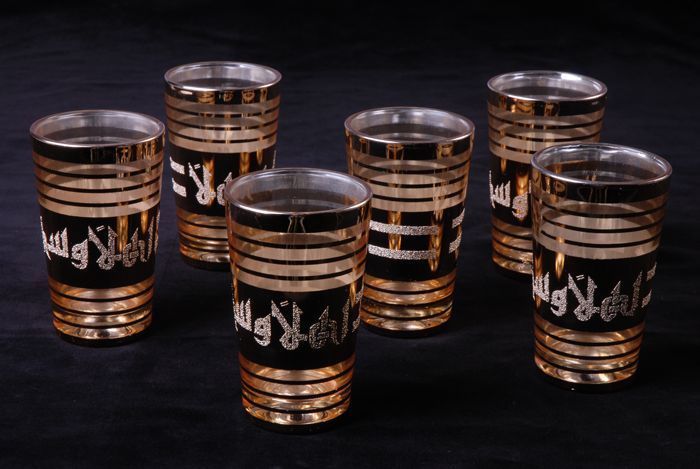 Set van zes theeglazen, waarop in Arabisch schrift '...