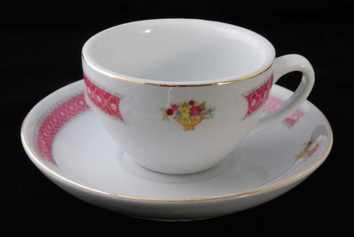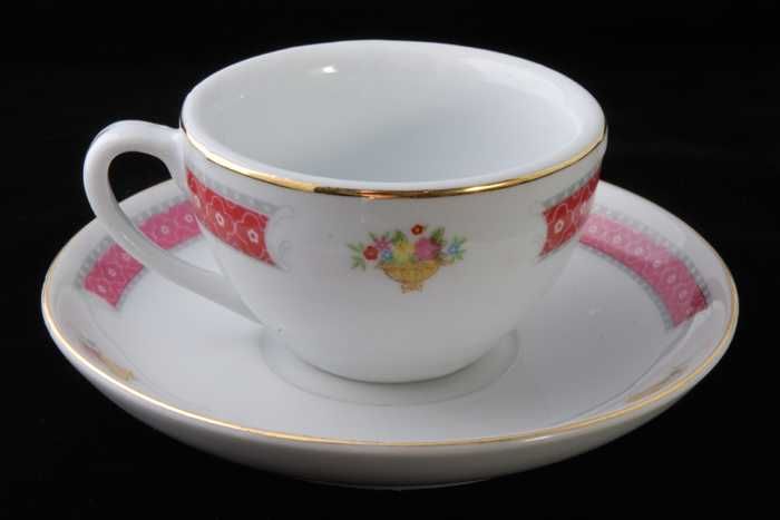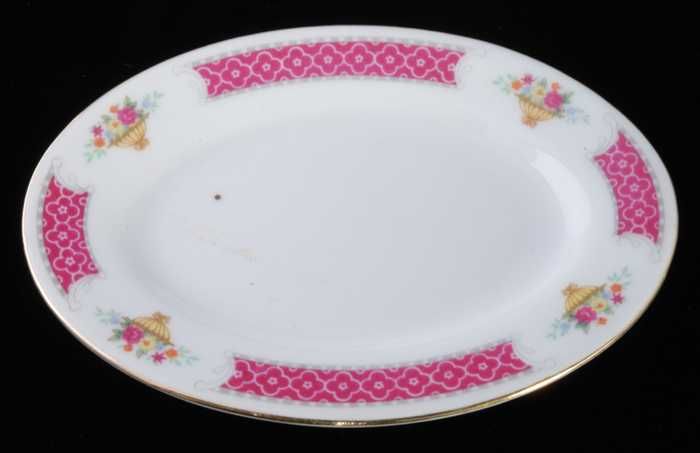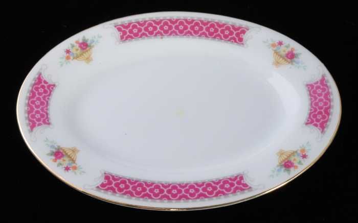 Twee glazen, ovale opdienschalen met bloemdecor op d...