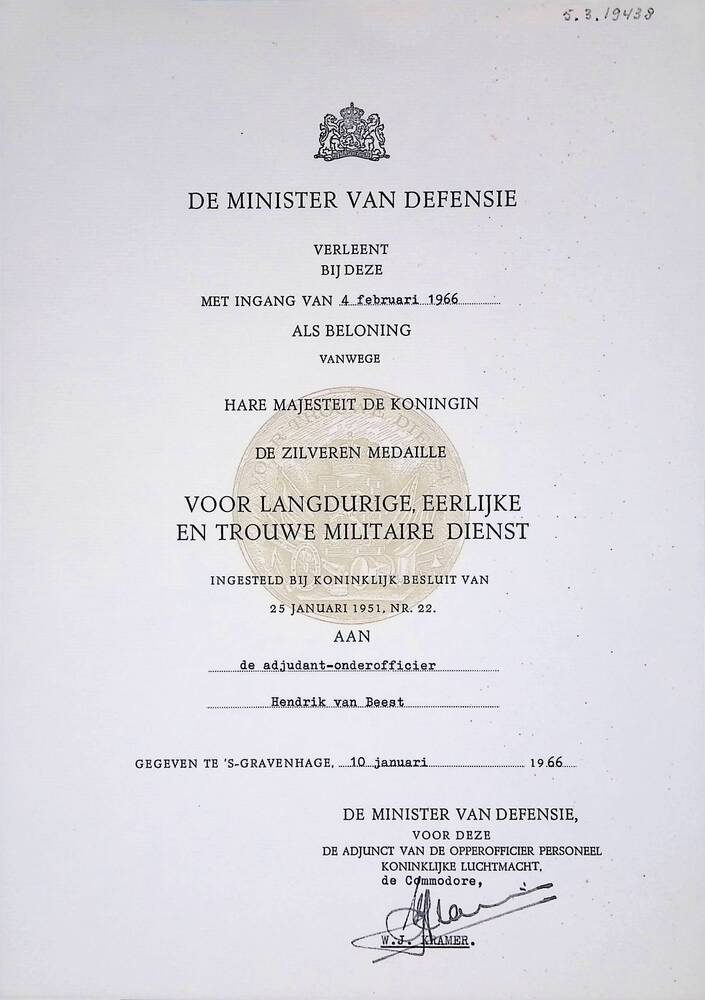 Oorkonde verlening Zilveren Medaille Ministerie van ...