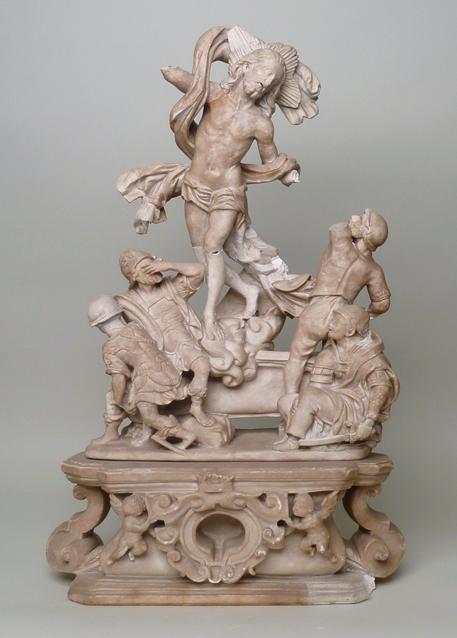 Christus' verrijzenis uit sarcofaag, op voetstuk met...