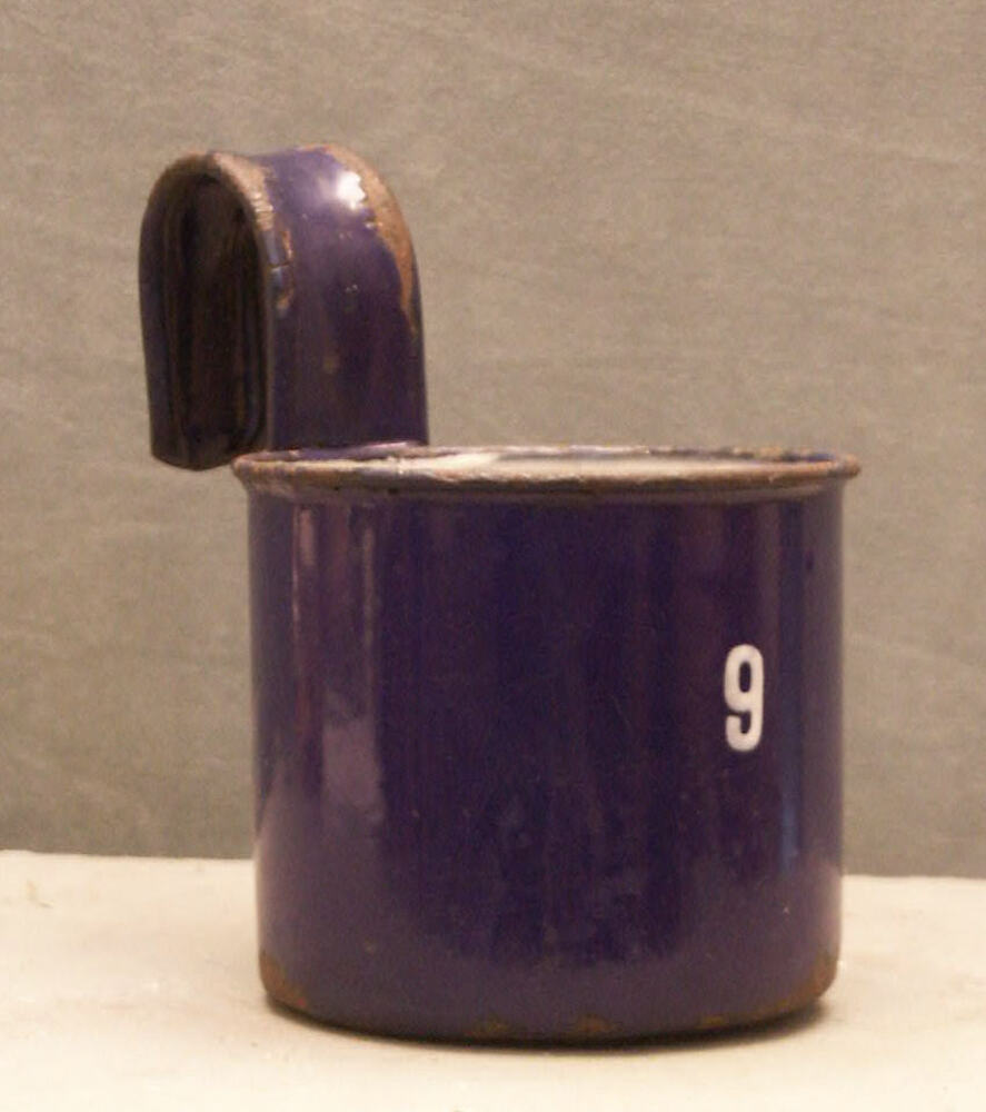 Maatbeker blauw geëmailleerd met nummer 9.
