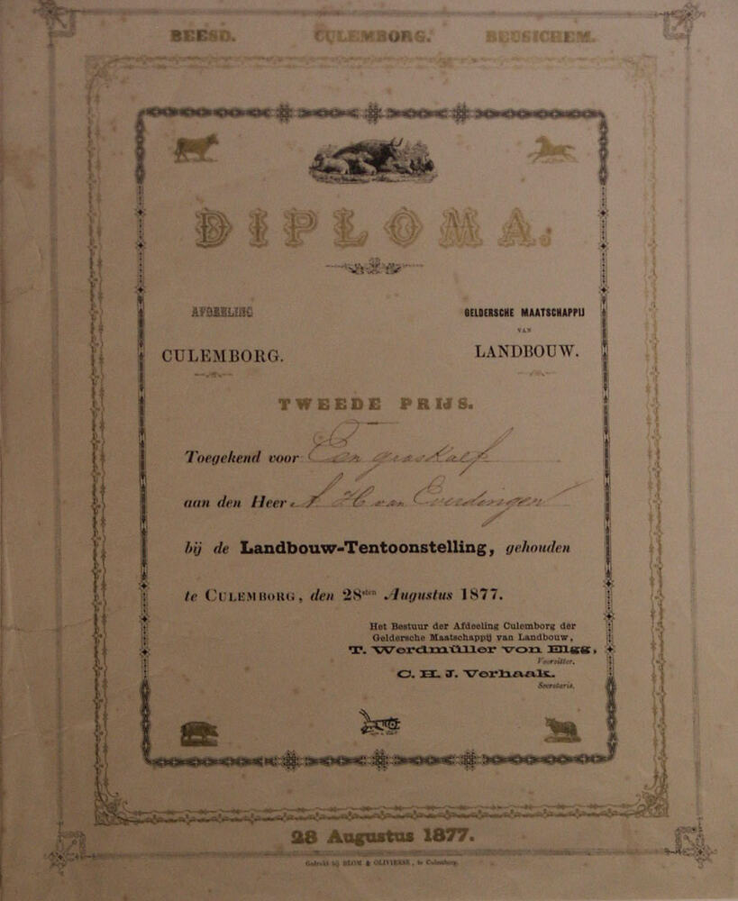 diploma bij landbouwtentoonstelling te Culemborg, 28...